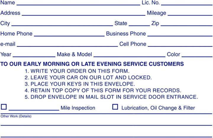 Elevate your after-hours transactions with our Dual-Purpose 2-Part After Hours Envelopes, meticulously crafted to meet the demands of modern business practices. Each envelope boasts a carbon interleave construction, providing peace of mind by safeguarding keys while offering a duplicate white copy for customers. Measuring a spacious 6" x 10-3/4", these envelopes accommodate various key sizes and quantities. Available in two options: shrink-wrapped for streamlined storage and distribution or unwrapped for immediate use. Whether you're a dealership, repair service, or property management company, our envelopes offer a professional solution to meet regulatory requirements. Our envelopes prioritize durability and reliability, ensuring they withstand the rigors of daily use. Ideal choice for businesses committed to efficiency, security, and customer satisfaction. Transform your after-hours processes today with our envelopes, engineered to exceed expectations and elevate your business standards.