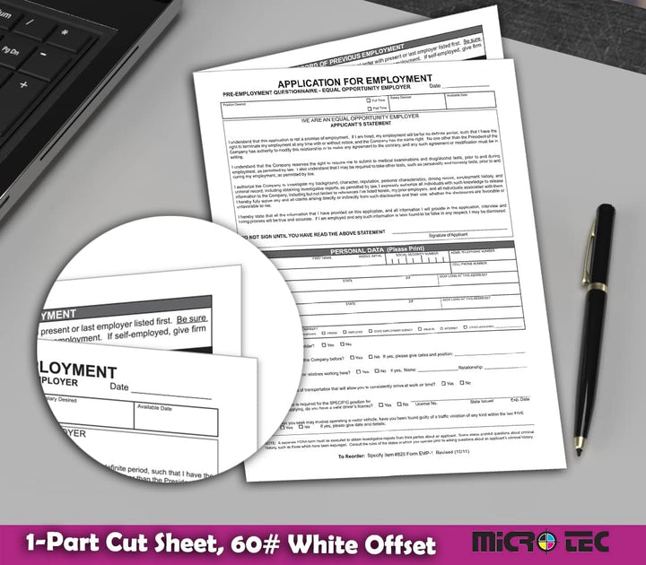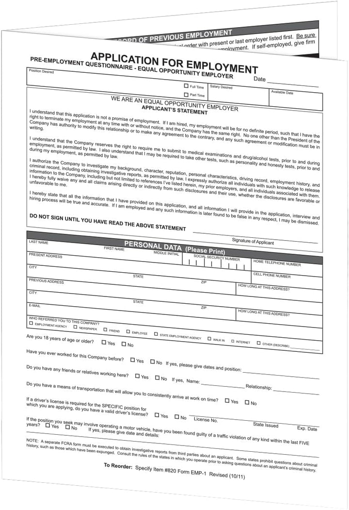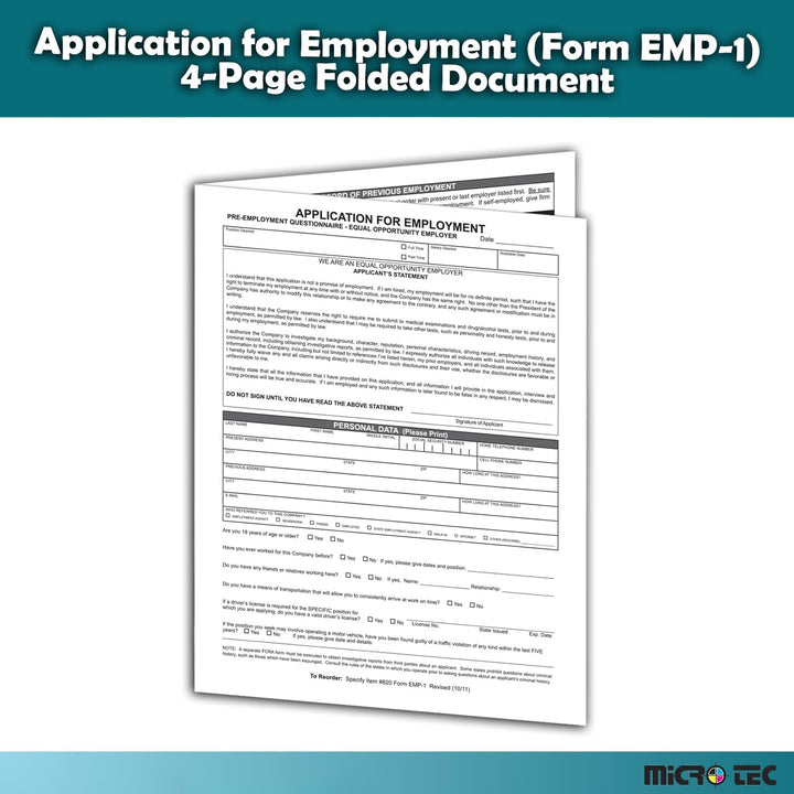 Application for Employment (Form EMP-1) - State & Federal Fair Employment Practice Law Compliant 4-Page Folded Document - 8.5" × 11", 1-Part Cut Sheet - Durable 60# White Offset Paper