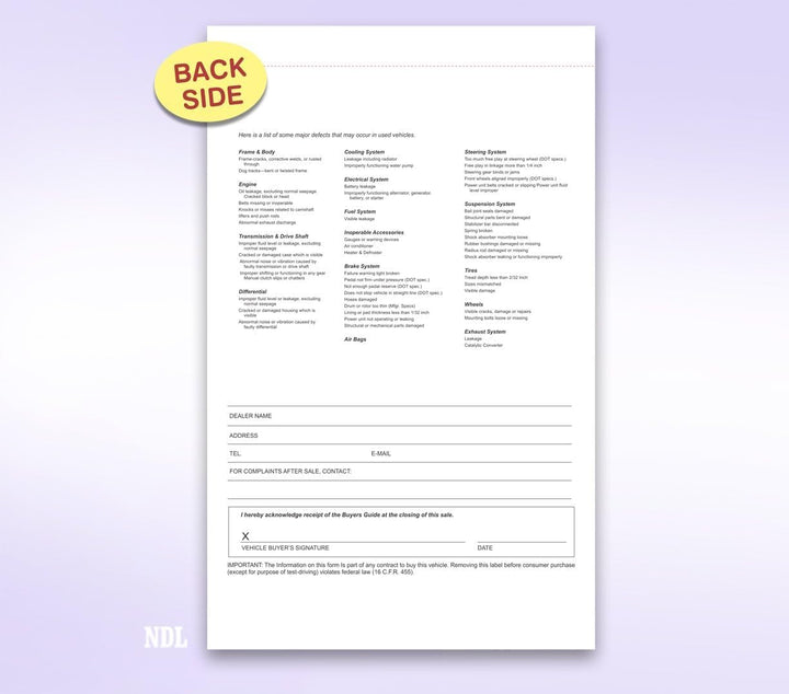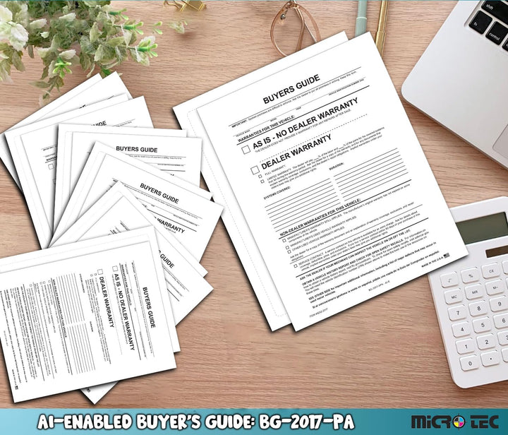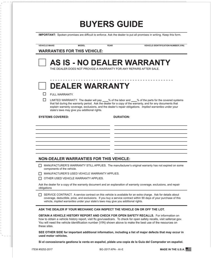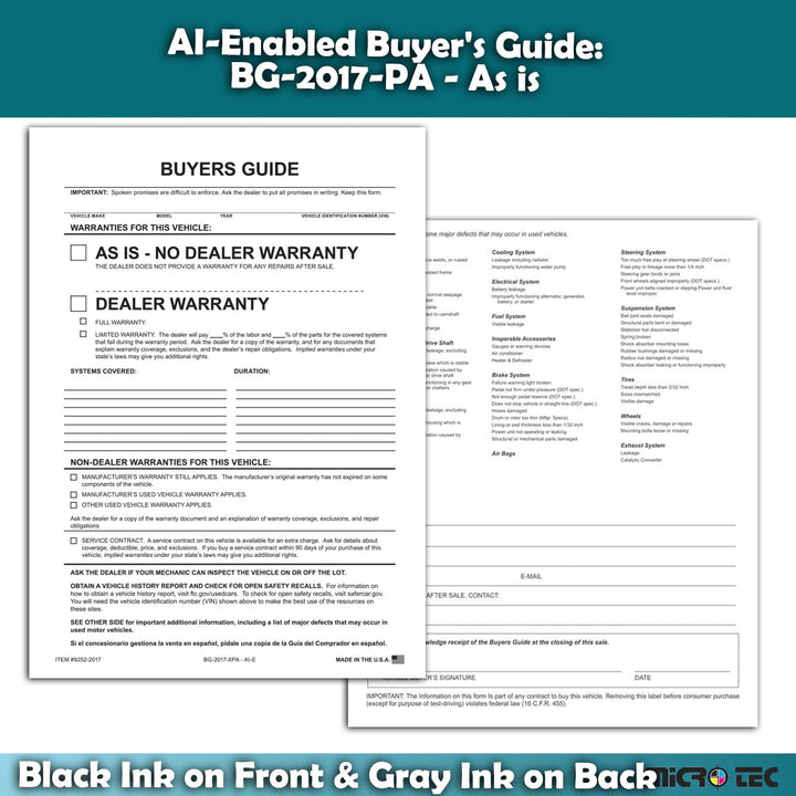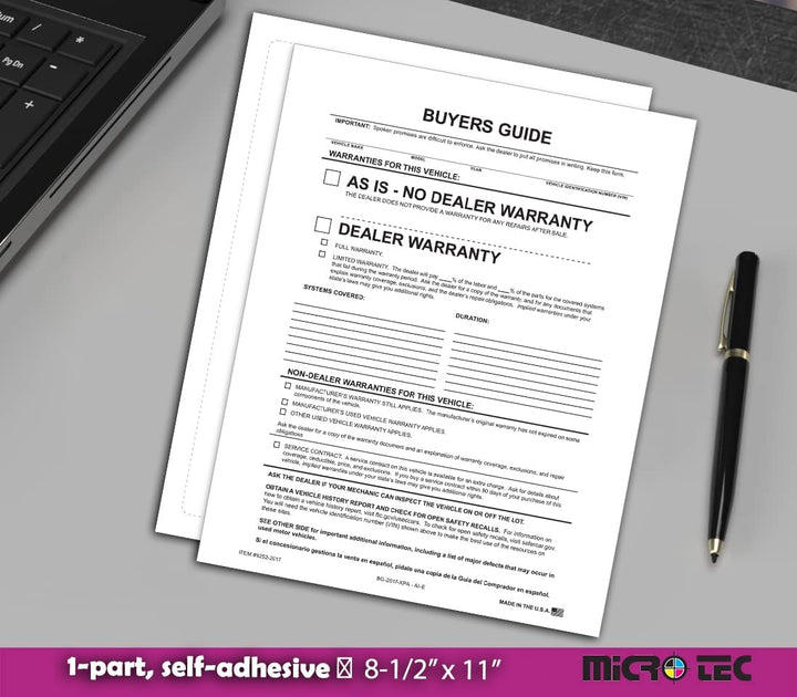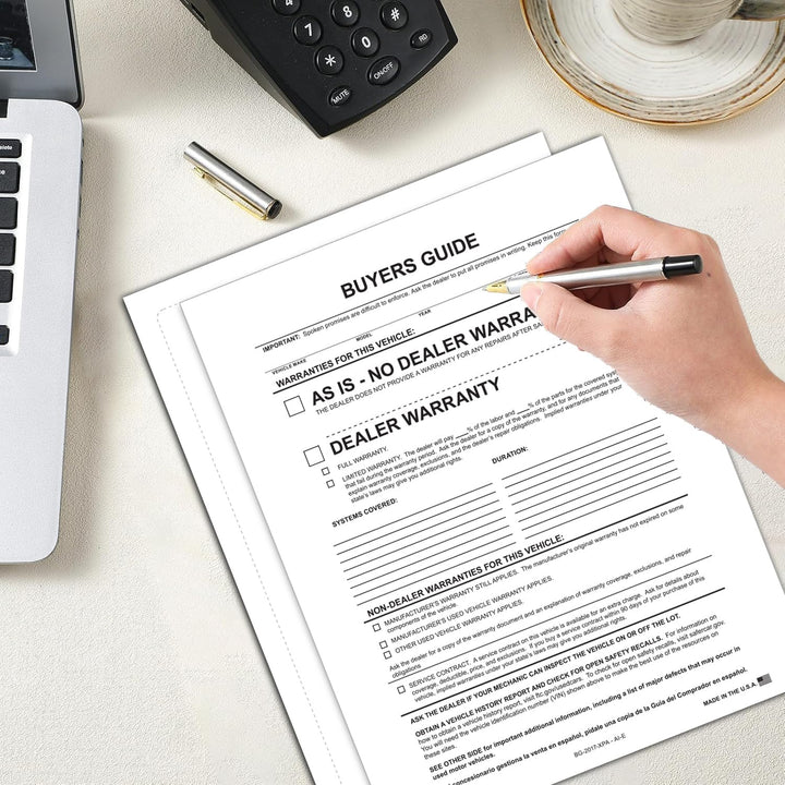 Ensure compliance and clarity with our As-Is Exterior Buyers Guide. Designed for automotive dealerships striving for FTC compliance, these guides feature permanent adhesive on all 4 sides, ensuring secure attachment to vehicle windows without obstructing visibility or movement. Ideal for heavy tinted windows, they withstand various weather conditions, maintaining legibility and durability over time. Each guide measures 8.5" Γ 11" and is laser compatible, providing ample space for essential vehicle information while ensuring professional presentation. The self-adhesive design allows for easy application and removal, facilitating smooth transactions and updates as needed. Whether you're updating existing practices or implementing new compliance measures, our guides offer reliability and ease of use, supporting transparent customer interactions and legal adherence. Streamline your dealership's operations and enhance customer trust with our weather-resistant As-Is Exterior Buyers Guide. Order now to improve compliance, simplify documentation, and elevate the professionalism of your vehicle sales process.