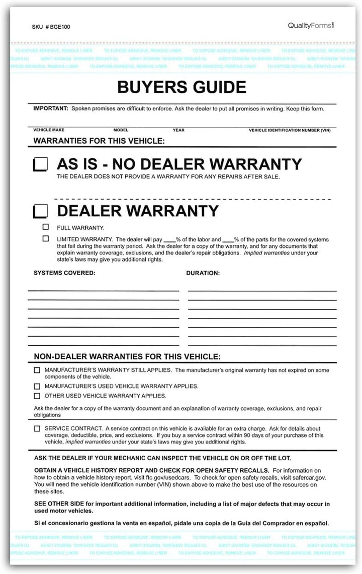 As-Is Exterior Buyers Guide for Car Dealerships - 8.5" x 11" 1-Part Weather-Resistant Forms with FTC Regulations - Laser Compatible and Permanent Self-Adhesive on 4 Sides