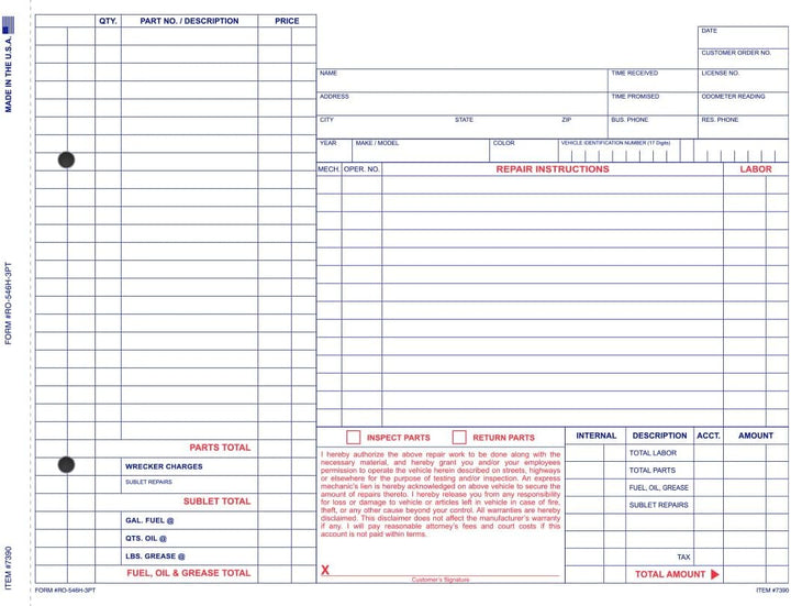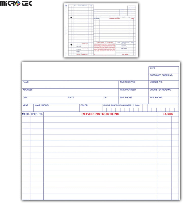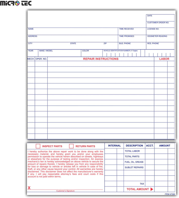 DETAILED VEHICLE MAINTENANCE & REPAIR DOCUMENTATION: Robust repair orders designed for automotive repair shops and service centers to capture comprehensive maintenance, diagnostics, parts used, and labor details, ensuring accuracy and detailed service records.