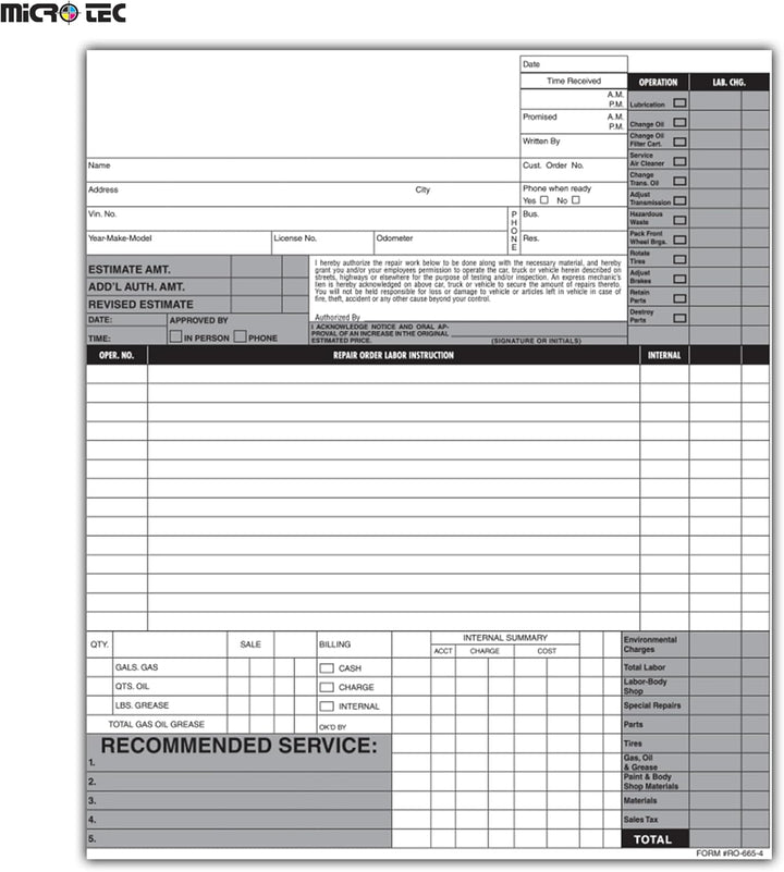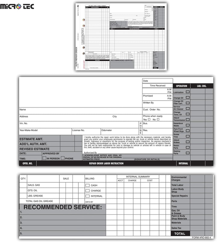 DETAILED VEHICLE MAINTENANCE DOCUMENTATION: Comprehensive automotive repair orders designed to document maintenance, diagnostics, and vehicle repair services, ensuring accuracy and thorough communication between technicians and customers.