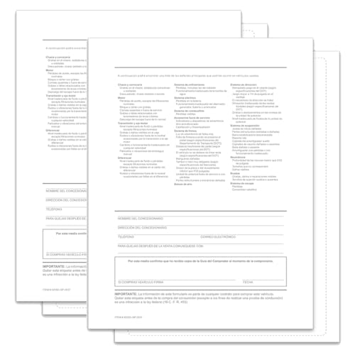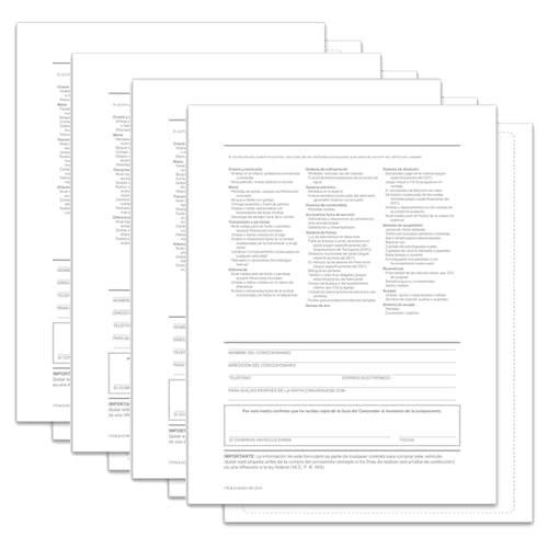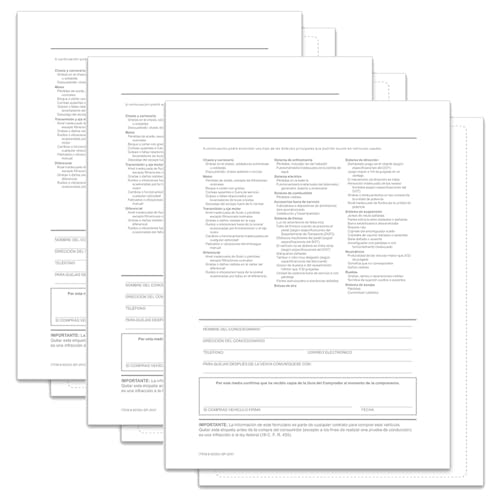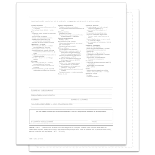 Backer Only Spanish Interior Buyers Guide for Car Dealerships - 8.5" x 11" 1-Part Fade-Resistant Forms with FTC Regulations - Laser Compatible and Permanent Self-Adhesive on 4 Sides