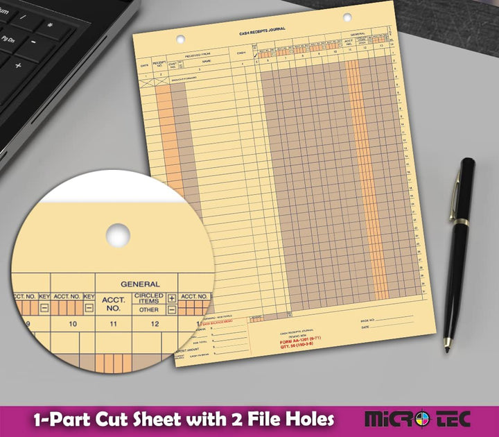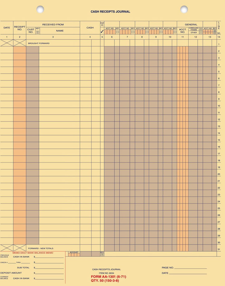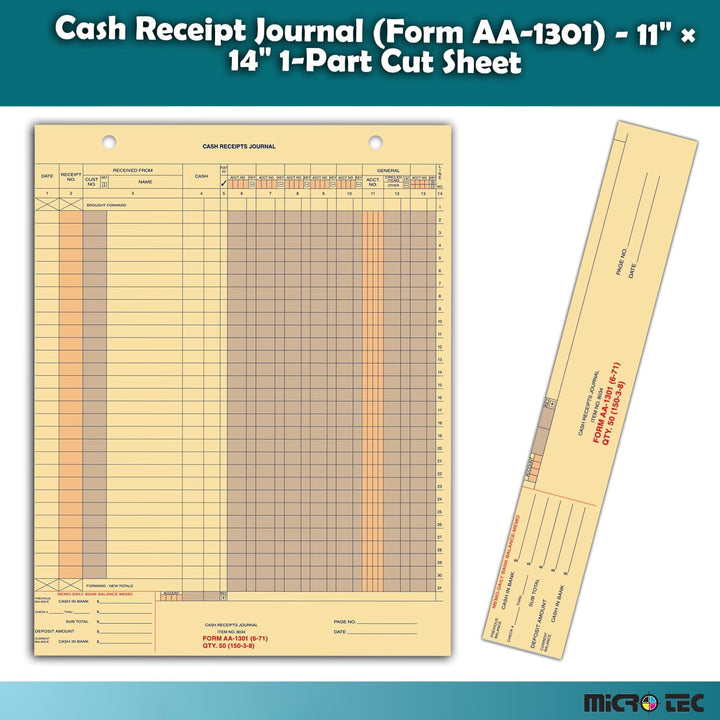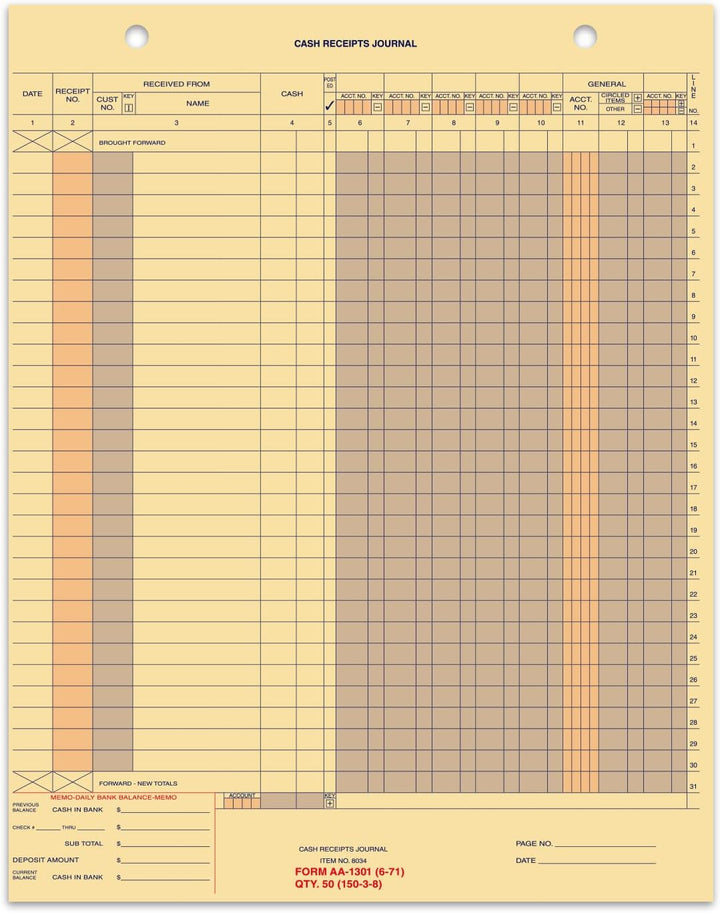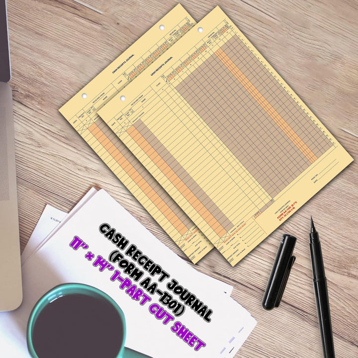 Buff Cash Receipt Journal (Form AA-1301) - 11" × 14" 1-Part Cut Sheet with 2 File Holes - Professional Cash Management, Record-Keeping & Streamlined Posting - Durable Buff Paper