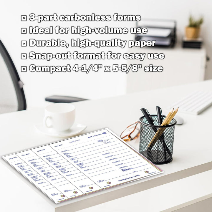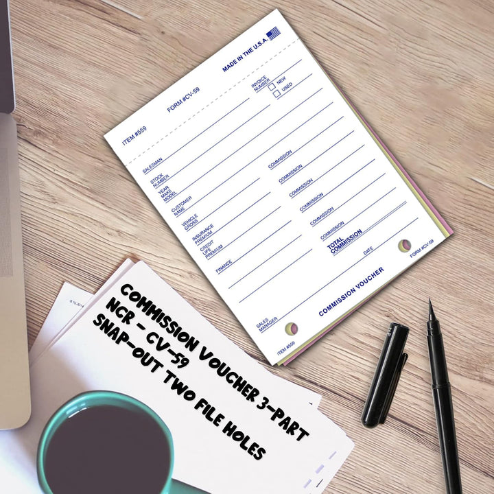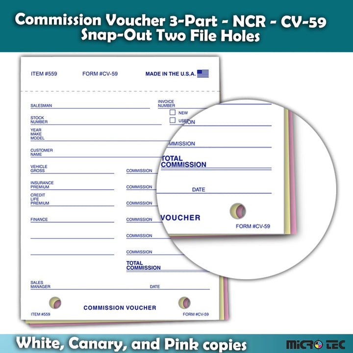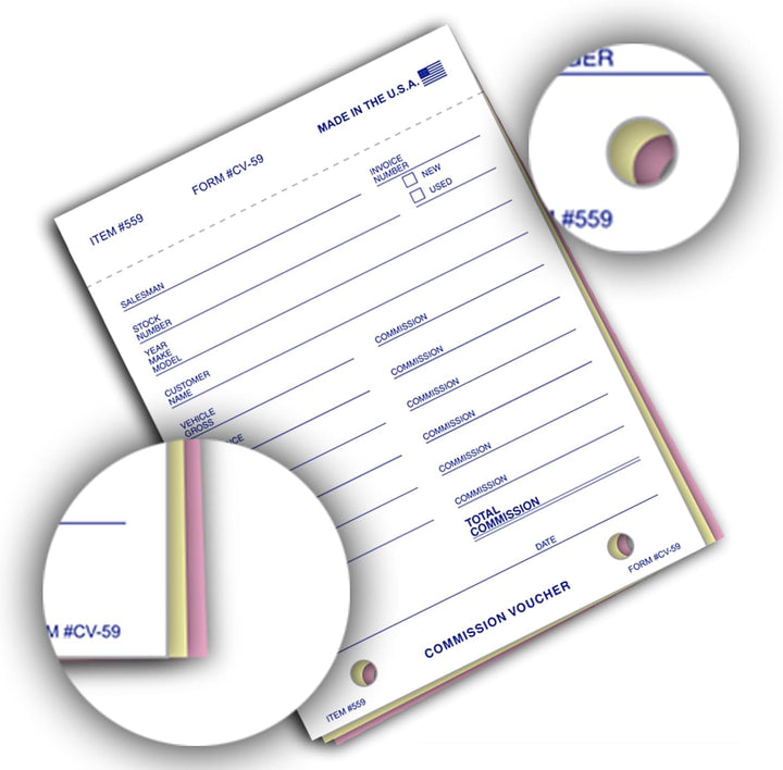 Commission Voucher (Form CV-59) - 4-1/4" x 5-5/8" Size, 3-Part Snap-Out Carbonless Forms (White, Canary, Pink) - Pre-Punched File Holes - Accurate Sales Commission Tracking