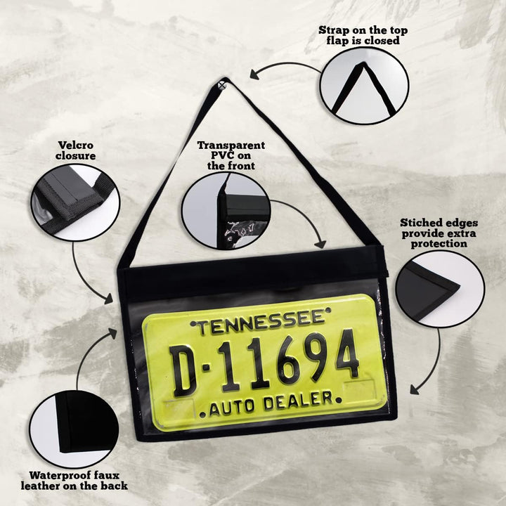 Introducing our Heavy Duty Vinyl Temporary Tag Holders with Attached Strap, designed to make test drives smoother and more efficient for automotive dealerships. Crafted from robust, long-lasting vinyl, these holders are built to endure frequent use and harsh weather conditions, ensuring reliable performance over time. The attached strap allows for quick, easy, and secure fastening to the vehicle, keeping the temporary tag firmly in place throughout the test drive. Our holders are specifically engineered to protect the vehicle's finish from scratches, scuffs, and other potential damage, maintaining its pristine condition. With a generous insert size of 15" × 8-1/2", these tag holders can accommodate larger temporary tags, offering versatility and compatibility with various tag dimensions. Designed to withstand diverse weather conditions, including rain, snow, and extreme temperatures, these vinyl tag holders ensure continuous protection and clear display of temporary tags in any environment. Ideal for automotive dealerships, our Heavy Duty Vinyl Temporary Tag Holders streamline the process of displaying temporary tags, enhancing both efficiency and professionalism during test drives. Order now and experience the convenience and protection they provide!
