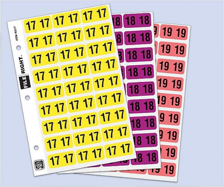 Elevate your file organization with File Right Year Labels in Ringbooks. Ensuring guaranteed availability for up to 10 years prior to the current year, these labels are a reliable choice for medical practices, healthcare facilities, offices, and more. Each Ringbook contains 270 Year Labels, featuring a clear laminate for longevity and easy installation. Designed with precision, these 1-1/2" x 3/4" labels are perfect for wrapping around end tab folders, displaying the 2-digit year on both sides. Durable and versatile, these self-adhesive labels are made to stick securely to file folders, preventing detachment and providing a professional touch to your filing system. The bright color design with a distinct number of characters enhances visibility and organization. Ideal for categorizing patient charts, tracking file creation and usage dates, and purging old records. Choose File Right Year Labels for a premium, organized, and efficient filing experience. Compare our prices and start saving today!
