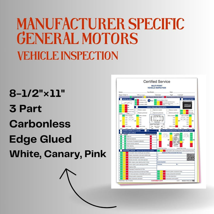 Elevate your auto care services with our Manufacturer Specific General Motors Inspection Forms. Tailored exclusively for General Motors vehicles, these forms provide a specialized solution for documenting inspections. Sized at 8-1/2"×11", they strike the perfect balance between offering sufficient space for detailed entries and remaining practical for everyday use. The 3-part carbonless system, combined with the edge-glued design, ensures a smooth and efficient documentation process. Part 1 comes in Full Color, enhancing visual appeal, while Parts 2 & 3 are printed in Black ink, providing distinct copies for varied record-keeping needs.