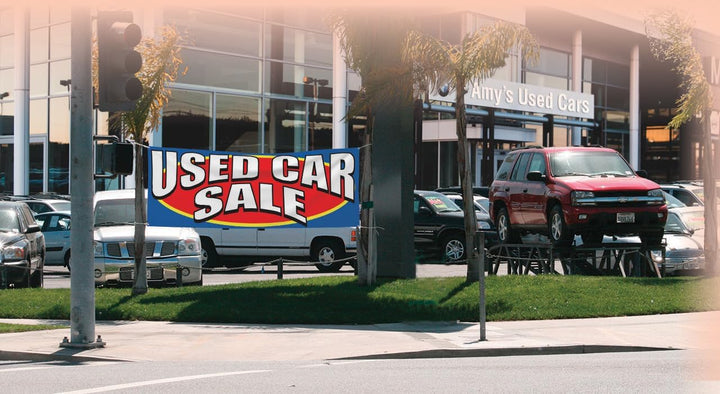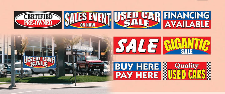 Giant Fabric Banner for Car Dealerships - 12' x 4.5' Durable Wind-Resistant Outdoor Banner - Single-Side Printed with Double-Stitched Edges & 4 Grommets per Side - Car Lot Advertising, Promotional Signage