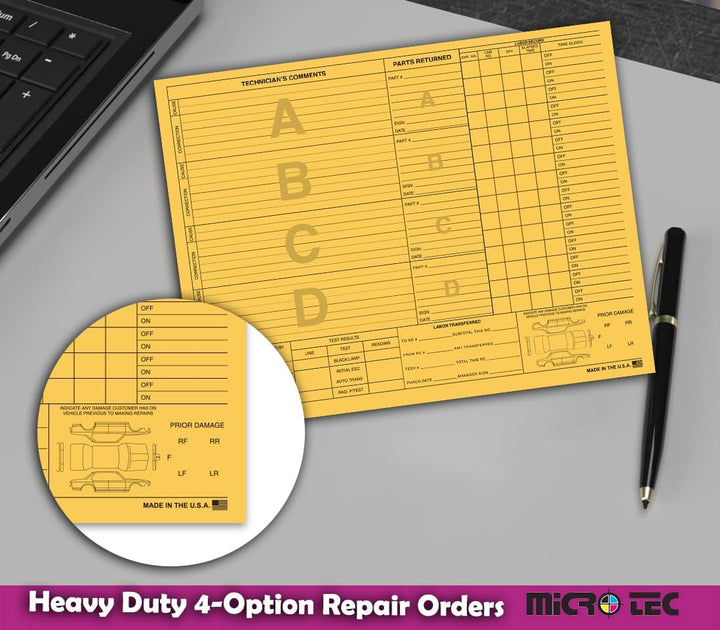 Maximize the efficiency and precision of your repair documentation processes with our Heavy Duty Repair Orders. Tailored for versatility across various repair industries, from automotive to maintenance services, these orders offer a comprehensive solution for recording repair tasks with meticulous detail. Crafted from durable 90# index printed stock, each 11" × 8-1/2" sheet provides a sturdy platform to document repair records reliably and withstand the rigors of daily use. Designed for seamless integration with a multitude of work order systems, our repair orders ensure compatibility and flexibility. With five distinct options available, these orders facilitate detailed and precise communication between technicians and clients, enhancing service quality and customer satisfaction. Whether you're managing a bustling service center or a specialized repair shop, our heavy duty repair orders are the ultimate option to optimize efficiency, accuracy, and professionalism in your repair documentation practices.