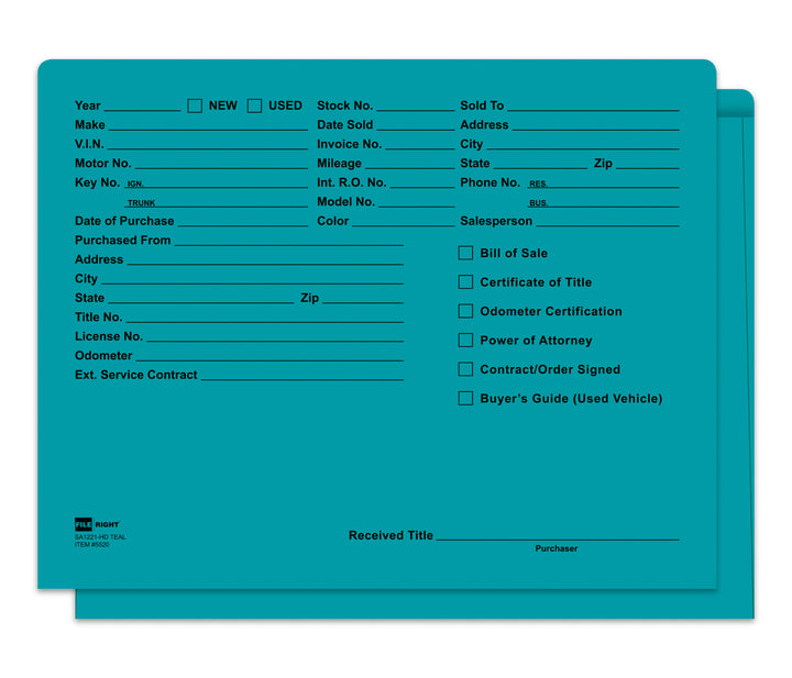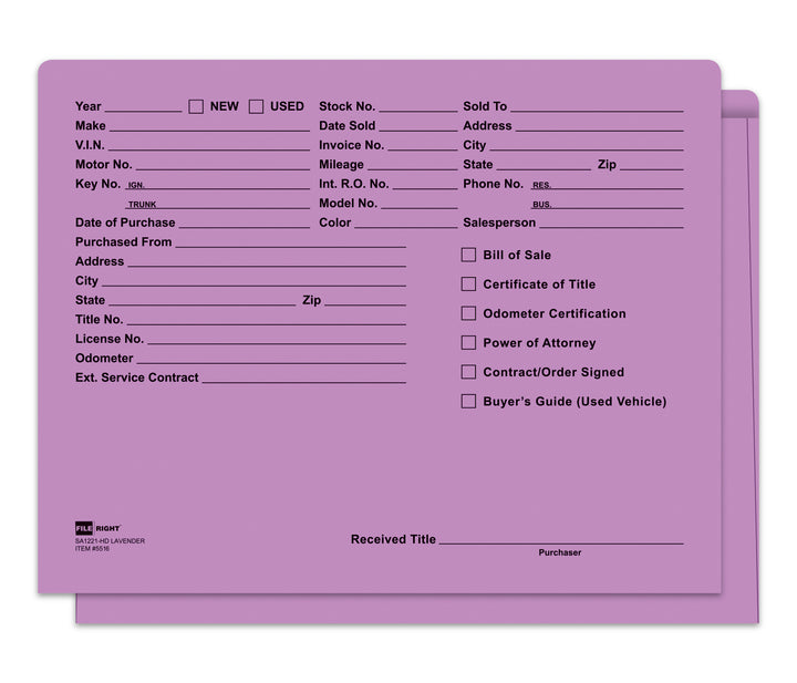 Upgrade your dealership's paperwork organization with our Heavy-Duty Deal Jackets. Engineered with robust 100# stock (8 Pt.), these jackets offer unparalleled durability, capable of handling extensive paperwork with ease. The exclusive 1/2" extension and rounded corners ensure effortless opening, saving time during hectic dealership operations. With versatile color options (10 in total), you can efficiently categorize and organize paperwork based on car types, years, and more.