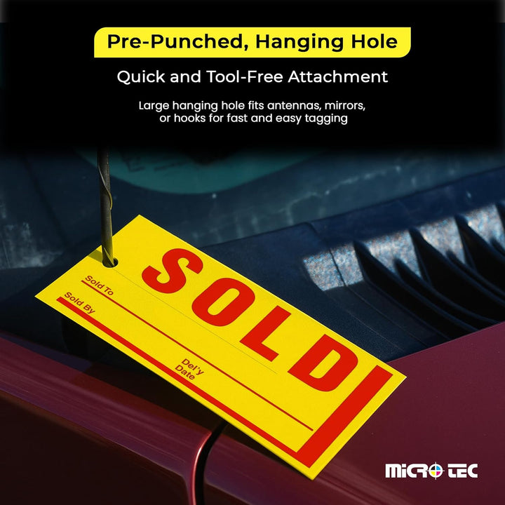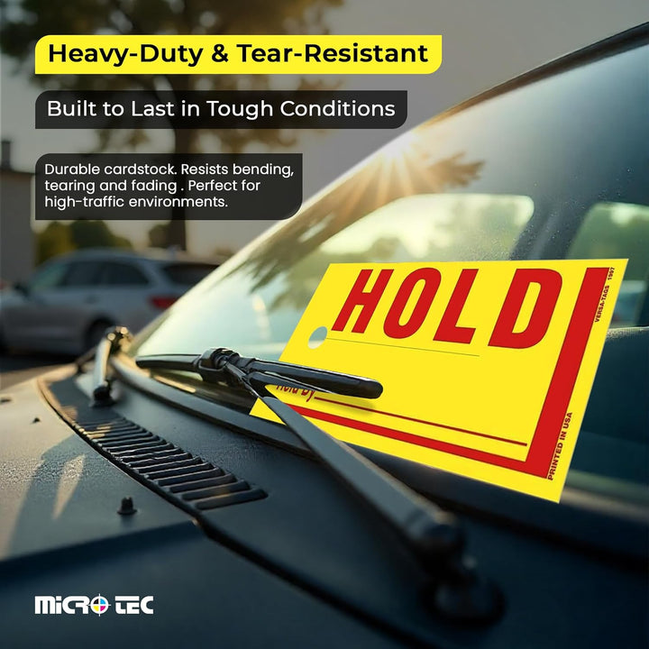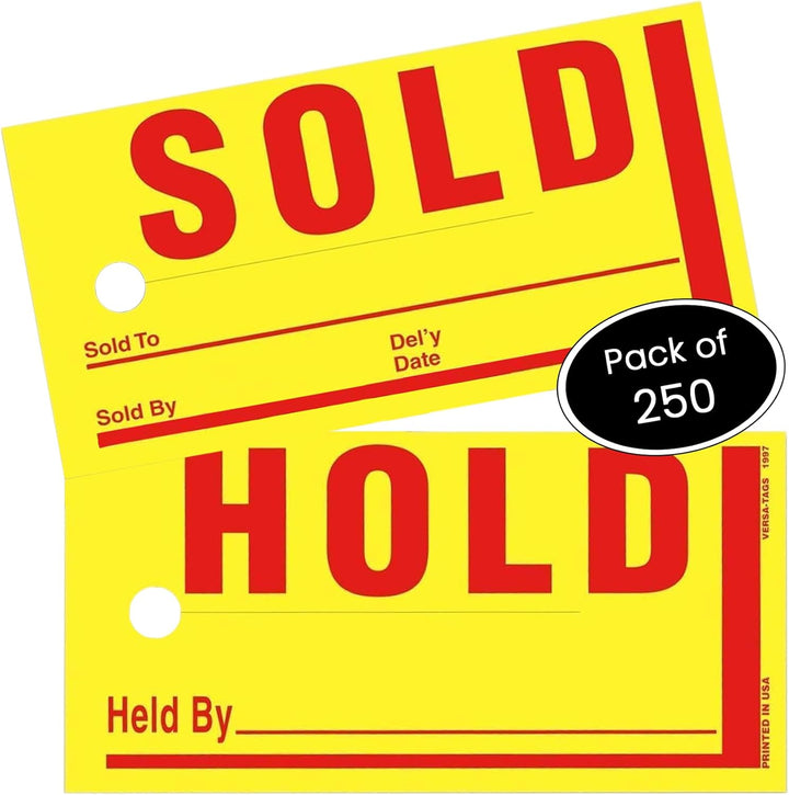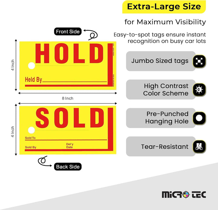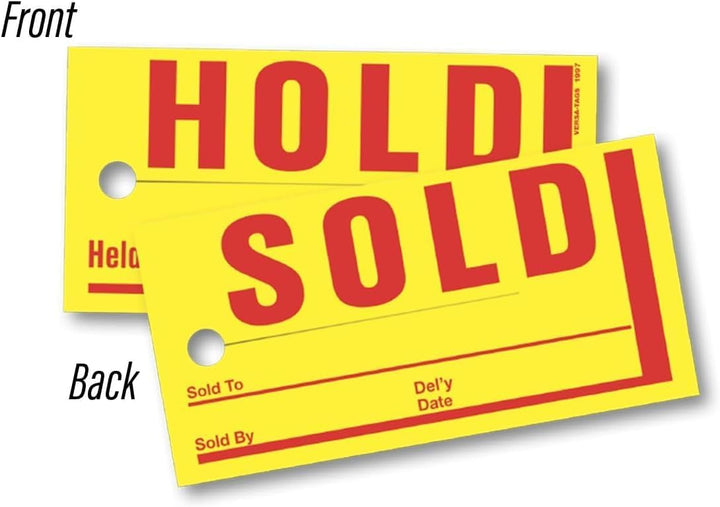 Jumbo Hold/Sold Tags for Car Dealerships - Heavy Duty 8" × 4" Merchandise Tags with 9/16" Hole - Bright Yellow Tags with Red Print
