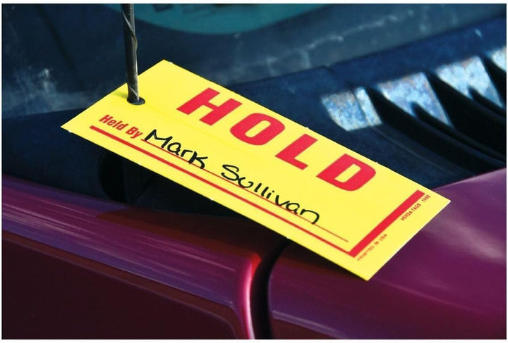 Enhance your car dealership's inventory management with our heavy-duty jumbo hold/sold tags. Designed for durability and functionality, these tags measure a substantial 8 inches by 4 inches, ensuring they are easily visible and hard to miss. Crafted from high-quality materials, they withstand handling and outdoor conditions, maintaining clarity and legibility. Each tag features a prominent 9/16-inch hole, allowing for secure attachment to vehicle mirrors, door handles, or other prominent locations. The bright yellow color ensures high visibility, while the bold red print clearly indicates whether a vehicle is on hold or sold, facilitating efficient inventory tracking and management. Ideal for car dealerships of all sizes, these tags are not only practical but also versatile. Use them to organize and categorize vehicles on your lot, simplifying the sales process and minimizing confusion. Their large size and clear labeling make them indispensable tools for sales teams, ensuring smooth operations and customer satisfaction.