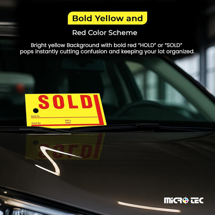 ✅ HIGH VISIBILITY: Bright yellow jumbo car dealership hold/sold tags with bold red print ensure staff can quickly identify vehicle status, whether on hold or sold.