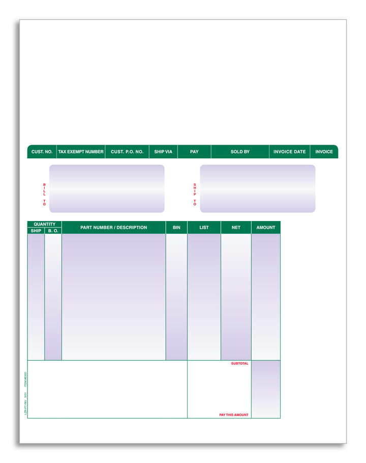 Laser Parts Invoices for Automotive Dealerships (Form LZR-PT-INV) - Universal Compatibility 1-Part 8-1/2" × 11" Laser Cut Sheets with 20# White Laser Paper