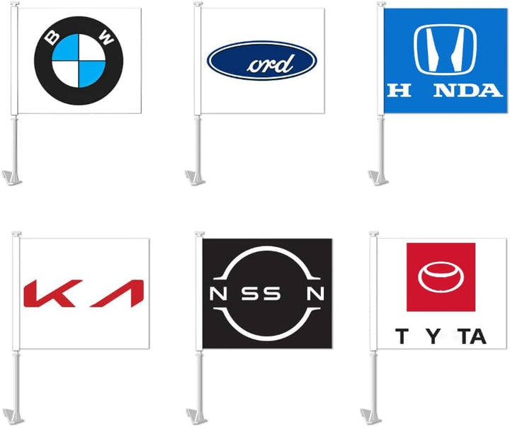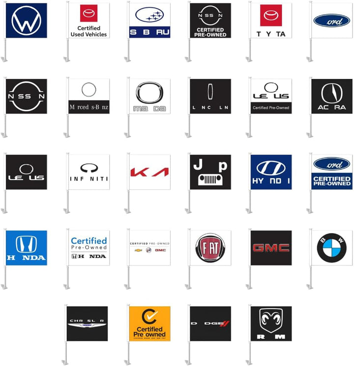 Elevate your dealership's branding with our Manufacturer Clip-On Window Flags, designed for effortless attachment to any car or truck side window. These flags are perfect for vehicles without antennas, offering universal compatibility across all models. Crafted from durable cloth material, they withstand outdoor elements, ensuring long-lasting vibrancy and visibility. Measuring 11" x 13" with a pole length of 19", they strike the perfect balance between size and effectiveness, enhancing your dealership's promotional efforts without overwhelming the window. Our clip-on window flags boast vibrant colors and clear printing, capturing attention and drawing customers to your dealership. Each flag comes fully assembled, ready for immediate use, saving you time and hassle during setup. Please note that manufacturer logos and trademarks are available for exclusive use by authorized dealers only, ensuring brand authenticity and compliance. Invest in these clip-on window flags to make a bold statement and increase visibility, ultimately driving more traffic and sales to your dealership.