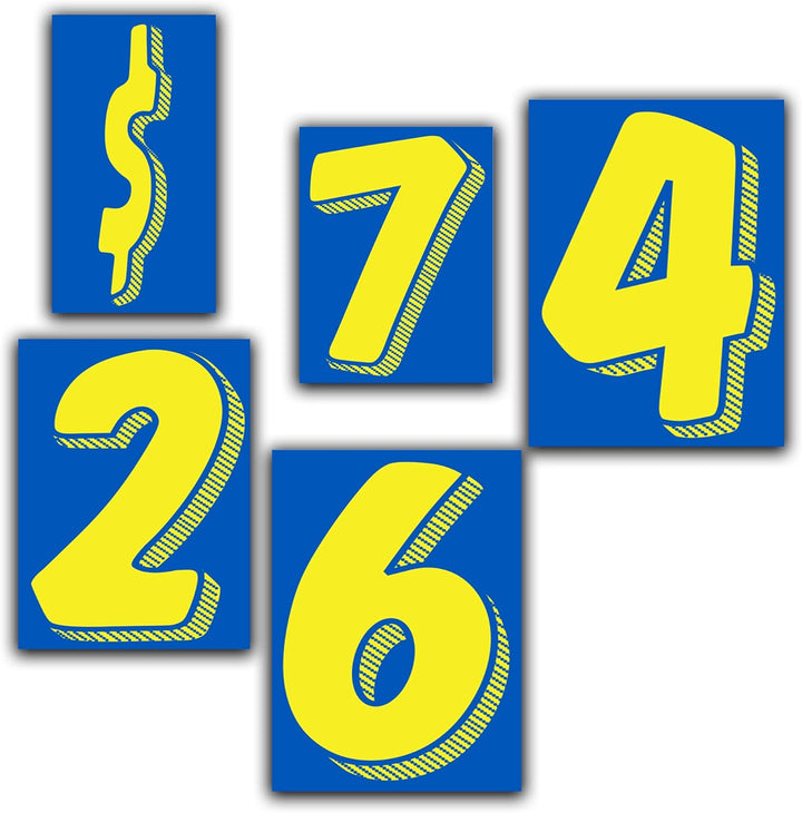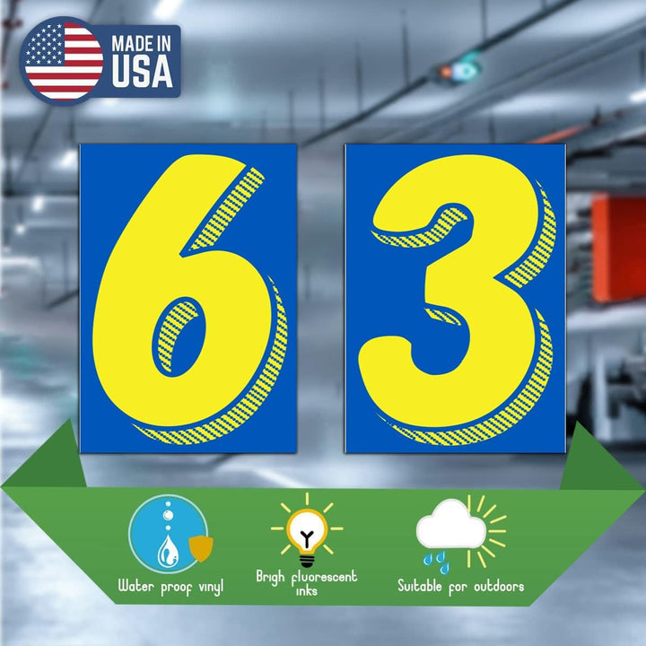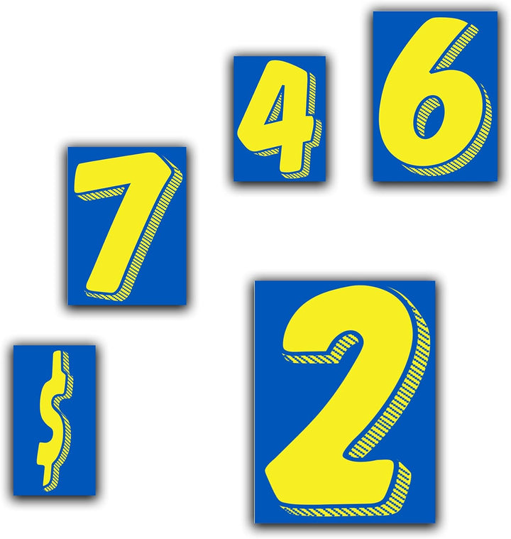 🚗 BOLD BLUE & YELLOW CAR DECALS – Eye-catching number window stickers in vibrant blue and yellow for auto dealership lot displays, vehicle pricing, windshield graphics, and car inventory marketing.