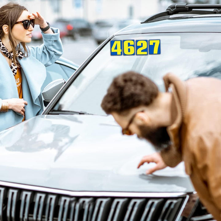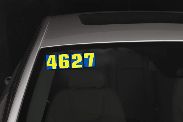 🚗 BLUE & YELLOW NUMBER DECALS – Vibrant blue and yellow car window stickers catch attention for auto dealership sales, windshield pricing, and vehicle lot marketing.