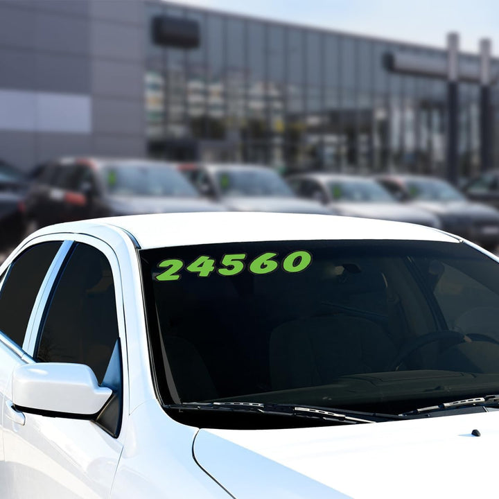 Elevate the presentation of your vehicle inventory with our meticulously designed Number Window Stickers, meticulously tailored with a striking green and black theme. Crafted from premium-grade weatherproof vinyl, these stickers are built to withstand the elements while retaining vibrant colors, ensuring long-lasting visibility. The inclusion of an easy on/off adhesive simplifies application and removal, providing flexibility in updating your displays. Additionally, the back slit feature ensures seamless installation, allowing for precise alignment on windows or other surfaces. With bulk packs, you'll have an ample supply to adorn your showroom vehicles, making them stand out and capture the attention of potential buyers.