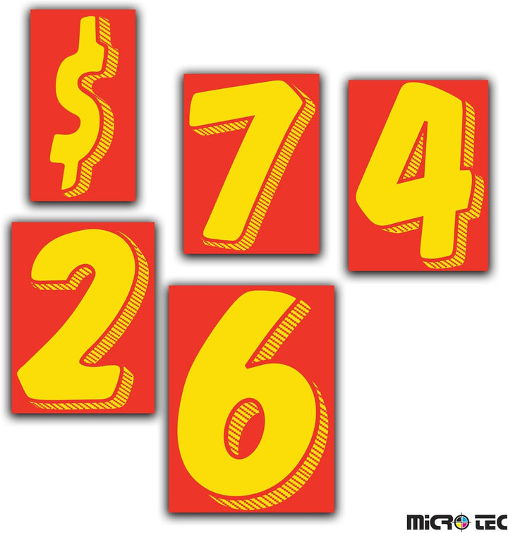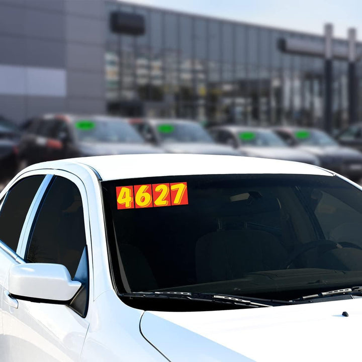🚗 RED & YELLOW NUMBER STICKERS – Bold red and yellow car window decals grab attention for auto dealership lot pricing, windshield advertising, and vehicle inventory displays.