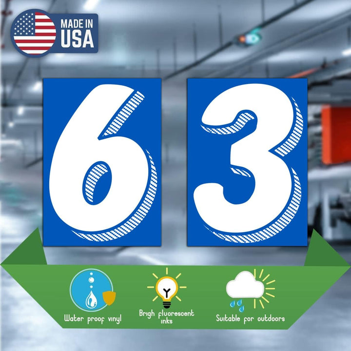 - Eye-catching white on blue numbers