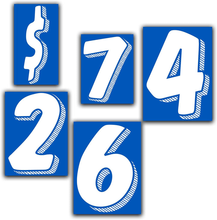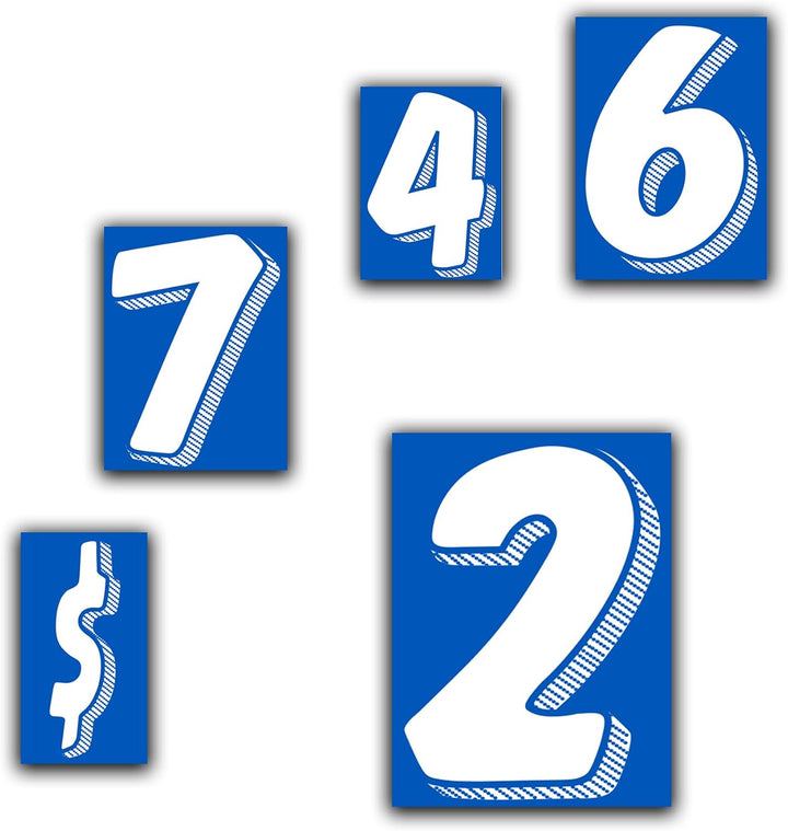 🚗 BRIGHT WHITE & BLUE CAR DECALS – Bold number window stickers in eye-catching white and blue, perfect for auto dealership lot displays, car inventory management, vehicle pricing, and promotional window graphics.