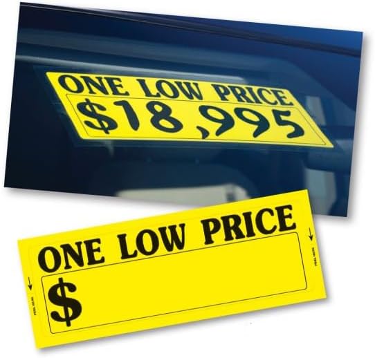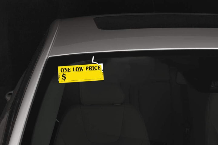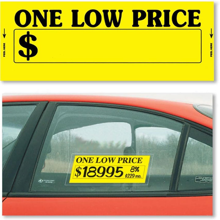 These "One Low Price" Window Stickers are designed to meet the demanding needs of car dealerships and retail environments. Crafted from heavy yellow card stock, these stickers are built to last, ensuring durability even in harsh conditions. The peel-off edge feature makes application a breeze, allowing you to effortlessly adhere them to the inside of vehicle windows without any hassle. Measuring 12" × 4-1/2", these stickers provide ample space for prominently displaying pricing information or special promotions, ensuring visibility from a distance. With bulk packs, you'll have a generous supply to keep your inventory well-stocked and your vehicles professionally presented. Elevate the appearance of your vehicles and convey a sense of trust and transparency to your customers with these professional-grade window stickers.