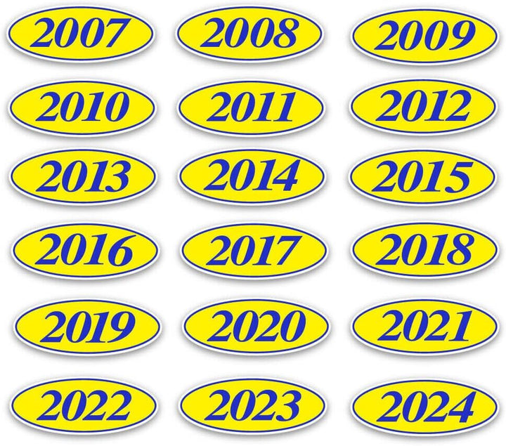 🚗 NAVY BLUE ON YELLOW STICKER: These oval year window stickers feature a vibrant navy blue on yellow design, making them perfect for car dealerships, auto lot inventory marking, fleet vehicle identification, and vehicle year display.