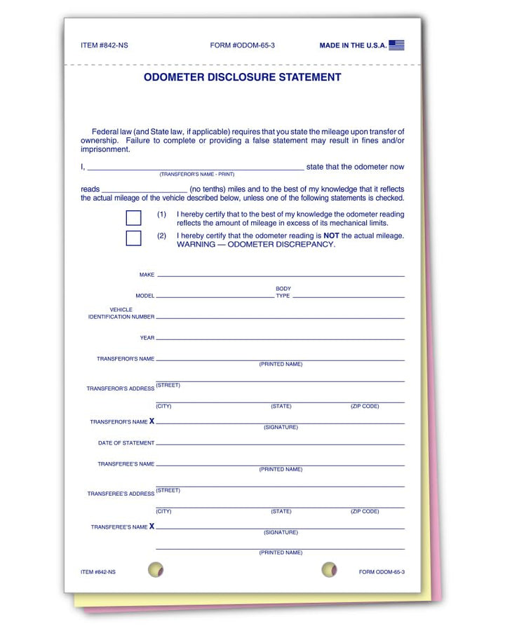 Plain Odometer Disclosure Statements with Blue Screen/No Screen - 5-2/3" × 9-1/8" 3-Part Snap-Out Carbonless Forms with 2 File Holes for Easy Posting - White, Canary, Pink