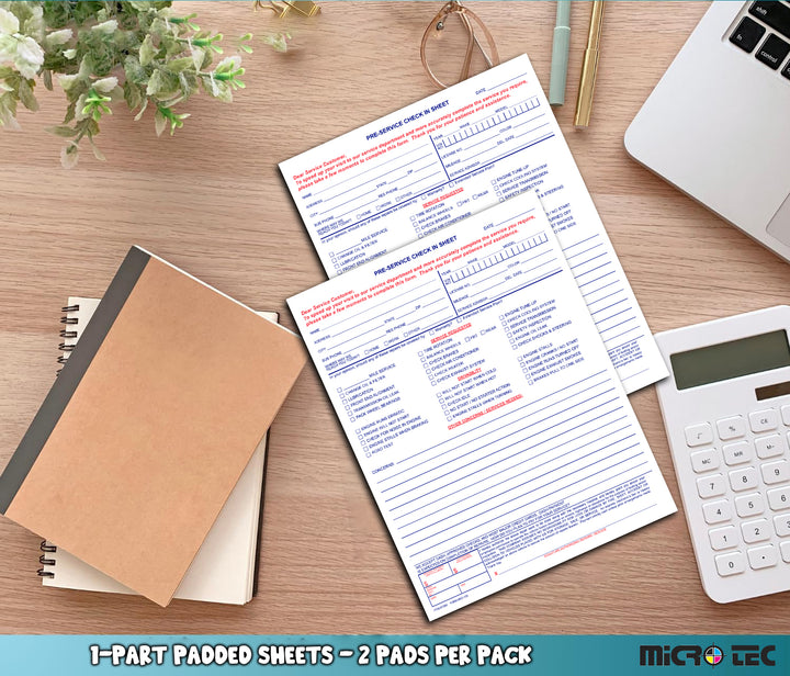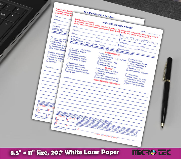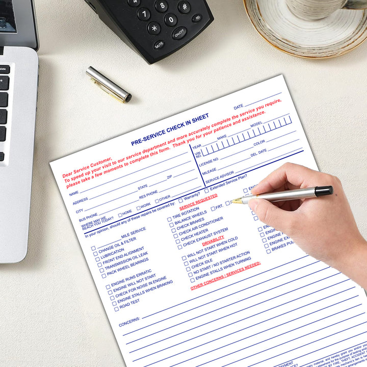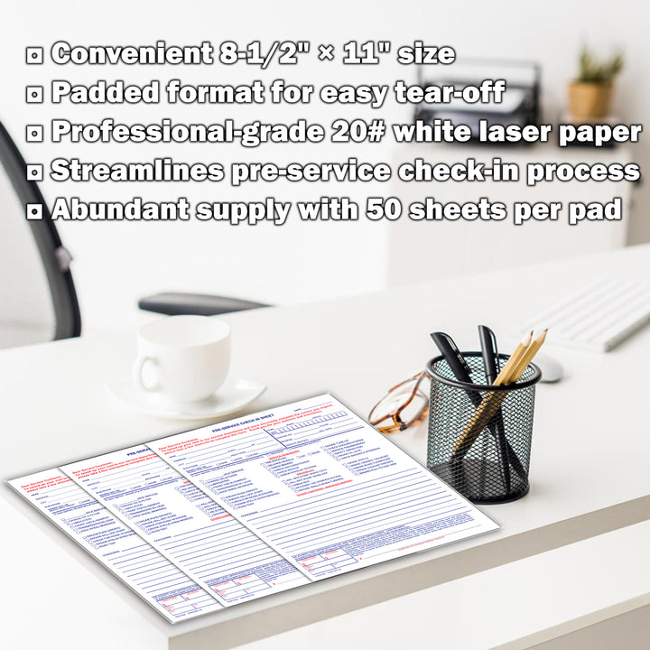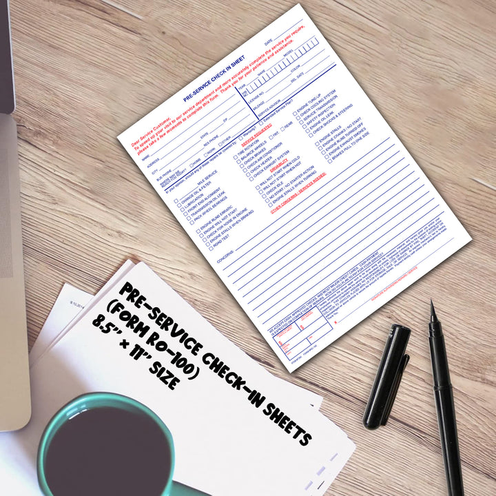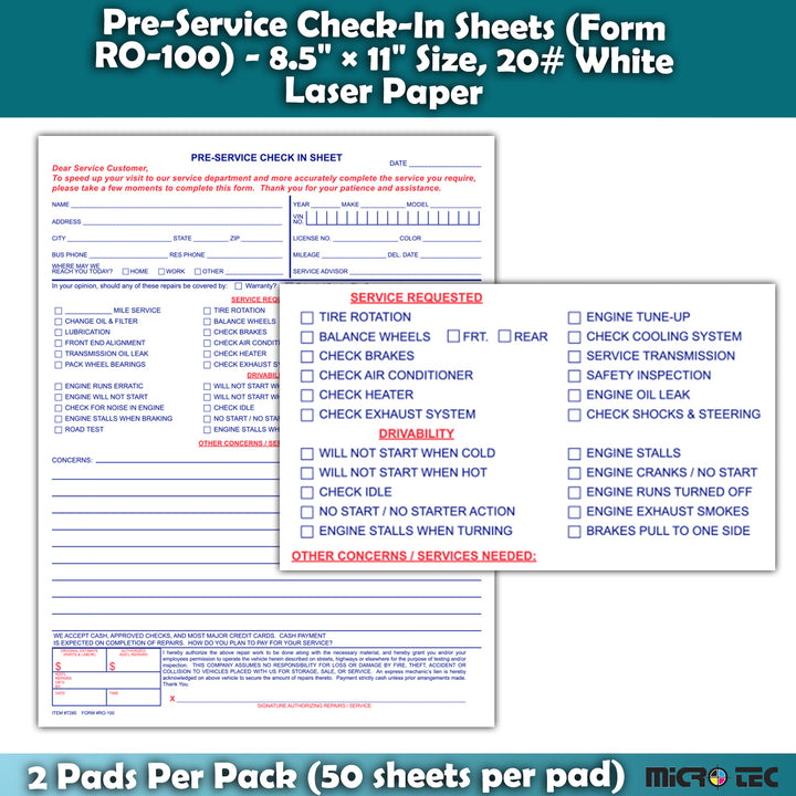 Pre-Service Check-In Sheets (Form RO-100) - 8.5" × 11" Size, 20# White Laser Paper Material - 1-Part Padded Sheets for Customer Communication and Service Efficiency