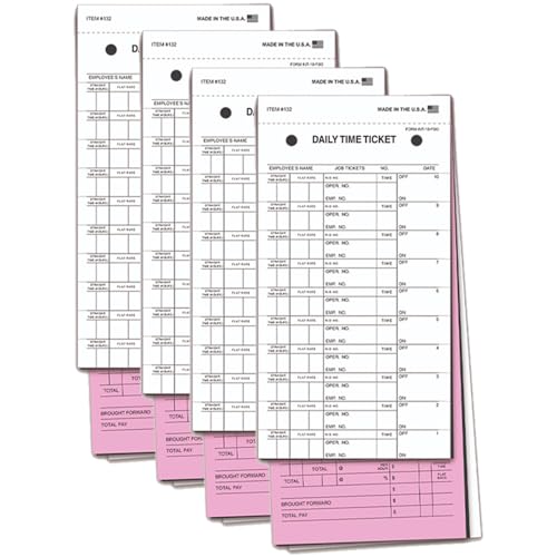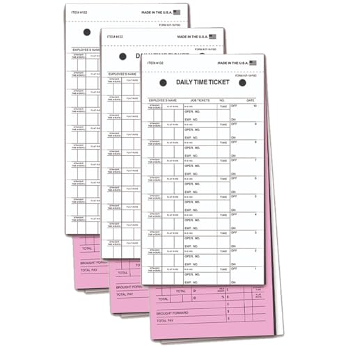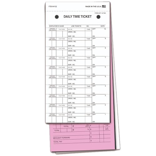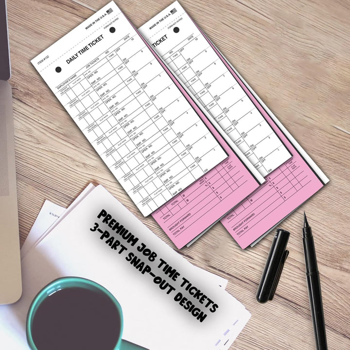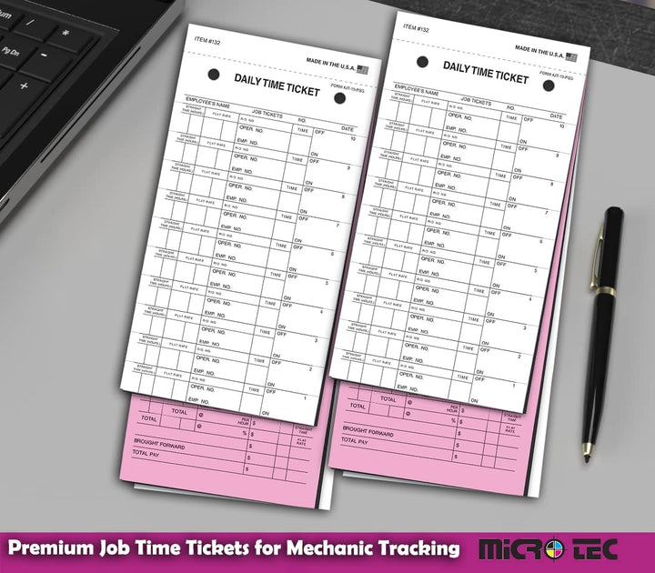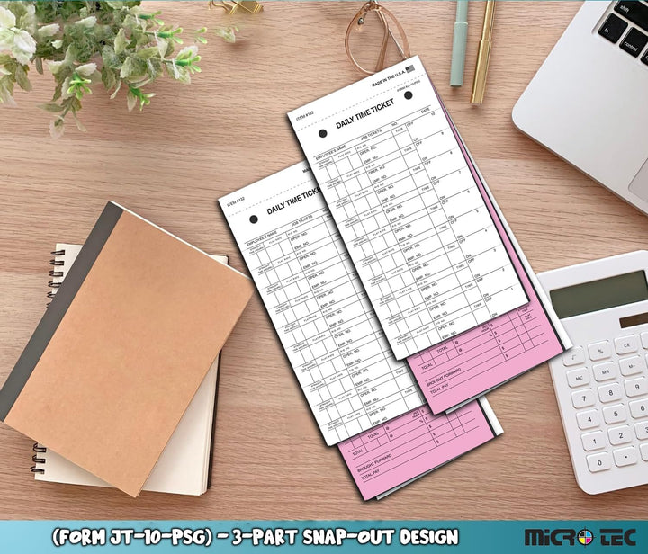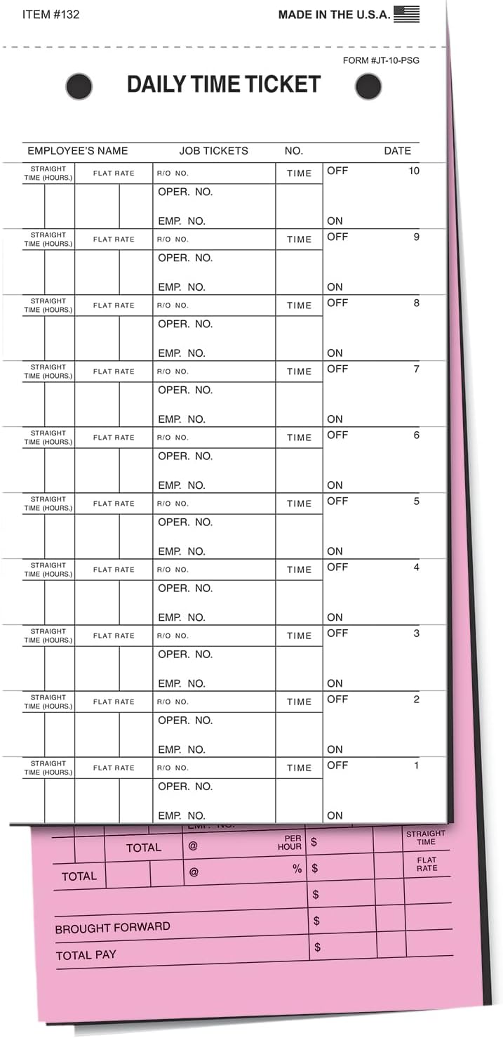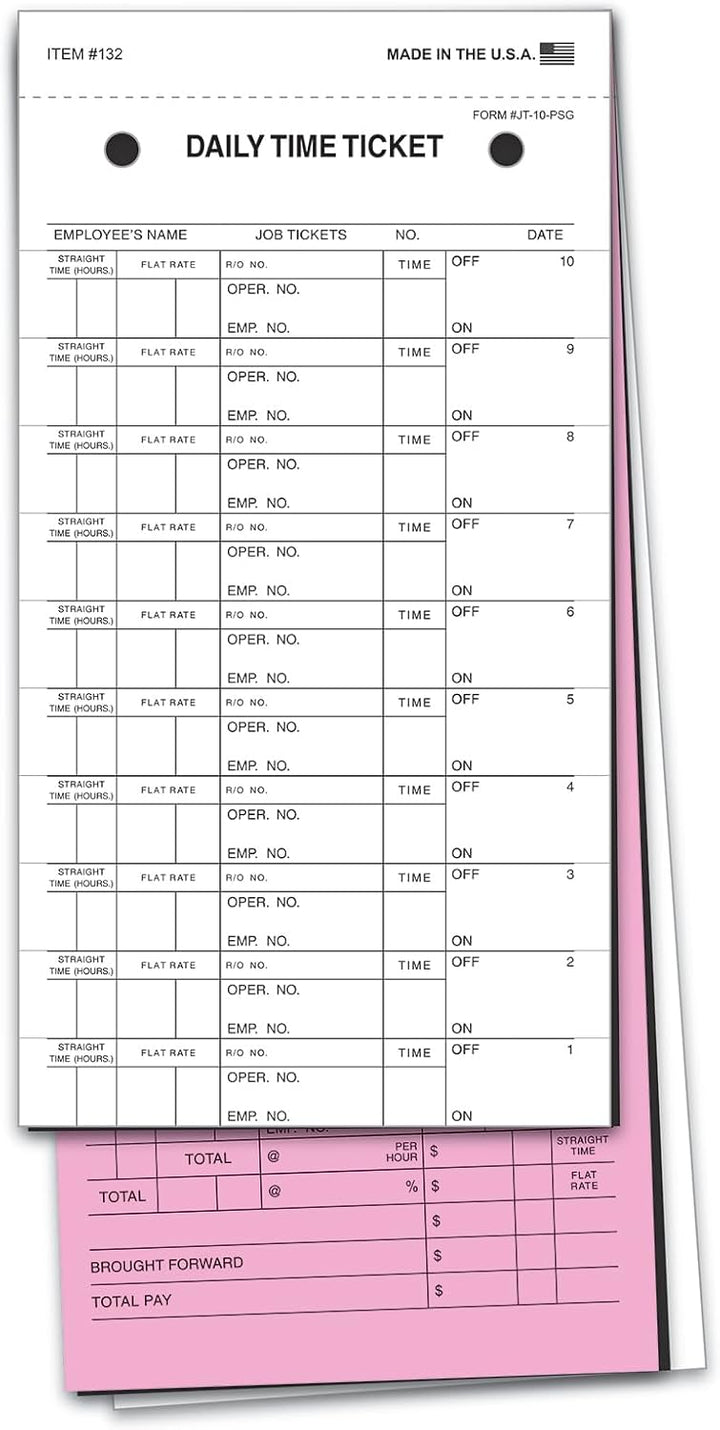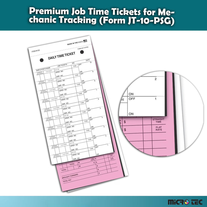Premium Job Time Tickets for Mechanic Tracking (Form JT-10-PSG) – Carbon Interleaved 3-Part Snap-Out Design – 4-1/4" x 9-3/4" Adhesive Time Cards – Pink & White Tag – Black Ink Printing for Auto Repair Shops