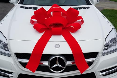 Premium Red Velvet Giant Car Bow - 30" Wide Vinyl Bow with Two 30" Long X 4 ½" Wide Tails - Weather-Resistant, Waterproof, Magnetic Base Bow for Indoor and Outdoor Use