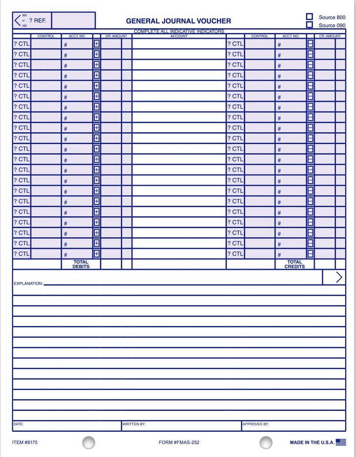 Streamline your financial record-keeping with our General Journal Vouchers (Form FMAS-252), designed to meet the exacting standards of the Ford Motor Company's accounting system. These vouchers offer unparalleled reliability and versatility in managing your financial transactions. Crafted from premium 20# white paper, each voucher provides a sturdy and pristine writing surface. Experience seamless integration with the Ford Accounting System with our vouchers' tailored compatibility. Whether you're a small business owner, an accounting professional, or part of the esteemed Ford Motor Company, our vouchers empower you to maintain accurate and organized financial records with ease. With dimensions of 8-1/2" × 11" and a 1-part cut sheet configuration, each voucher offers ample space for capturing detailed transactional data. Designed for optimal usability, our vouchers simplify the recording process, reducing errors and saving you valuable time.