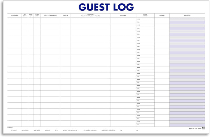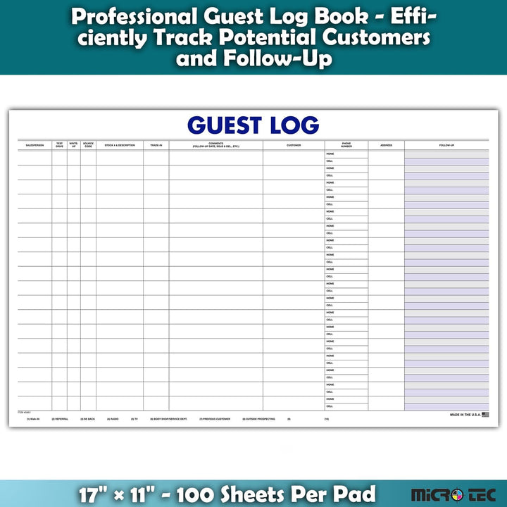 Professional Guest Log Book - Efficiently Track Potential Customers and Follow-Up - Ideal for Automotive Dealerships, Repair Shops, and Service Centers - 17" × 11" - 100 Sheets Per Pad