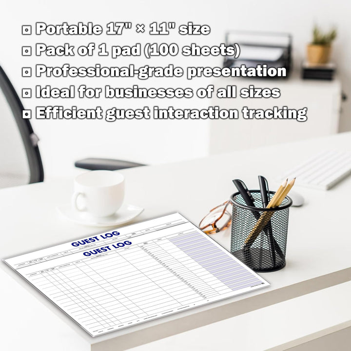 📰 LARGE & AMPLE SHEET COUNT: Each 17" × 11" guest sign-in pad includes 100 sheets, providing plenty of space to log visitor names, contact details, appointments, and notes, ensuring no customer data is lost.