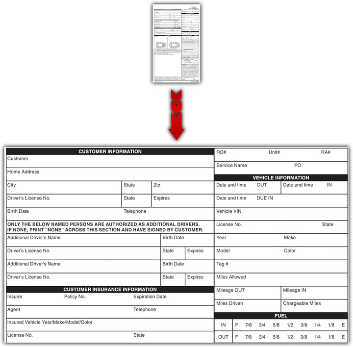 RED INK SEQUENTIAL NUMBERING: Numbered forms improve record-keeping accuracy by facilitating straightforward tracking during vehicle rentals, loaner returns, and asset management.
