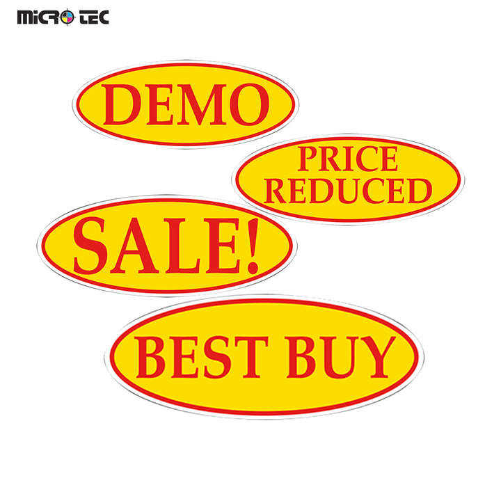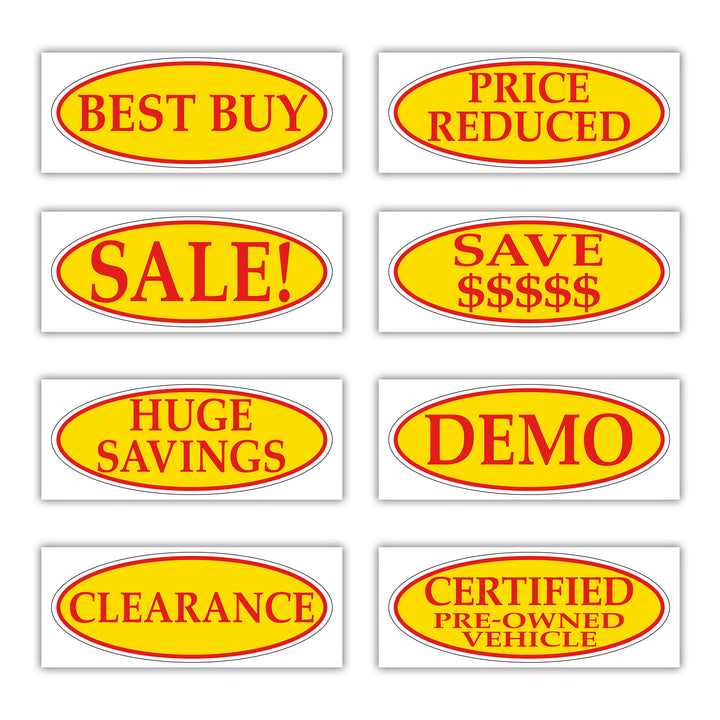 SALE! Red on Yellow Oval Window Sticker for Car Dealerships - 14" x 5-1/2" Size - Premium Weatherproof Vinyl for Long-Lasting Visibility
