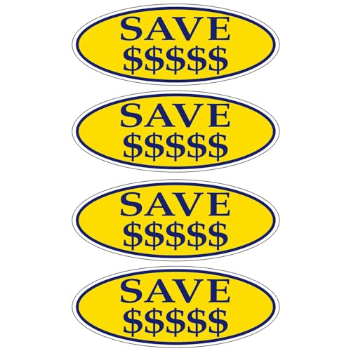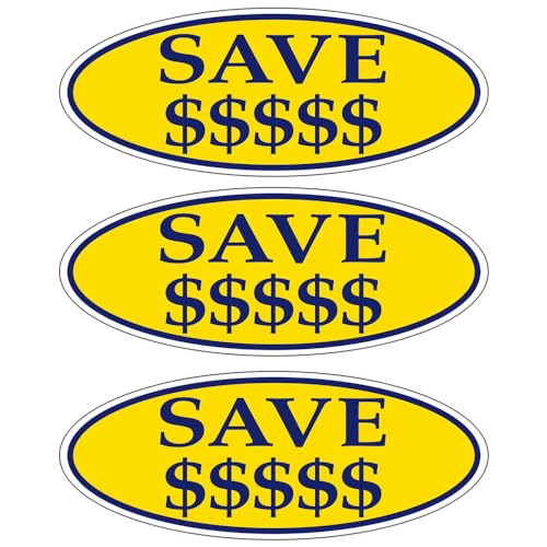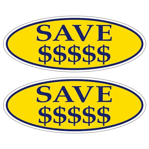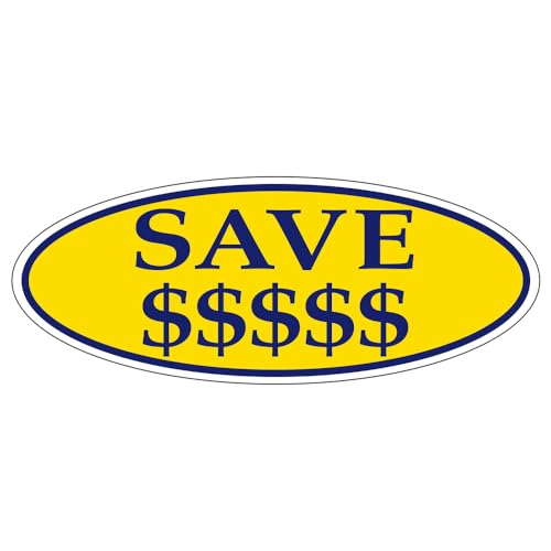 SAVE $$$$$ Dark Blue on Yellow Oval Window Sticker for Car Dealerships - 14" x 5-1/2" Size - Premium Weatherproof Vinyl for Long-Lasting Visibility