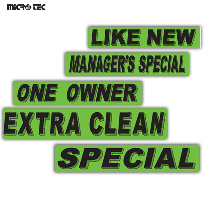Slogan Window Stickers for Car Dealerships – Black on Fluorescent Green – Weatherproof Vinyl Decals – Large 14.5" × 2.75" – Easy On/Off Adhesive – 12-Pack