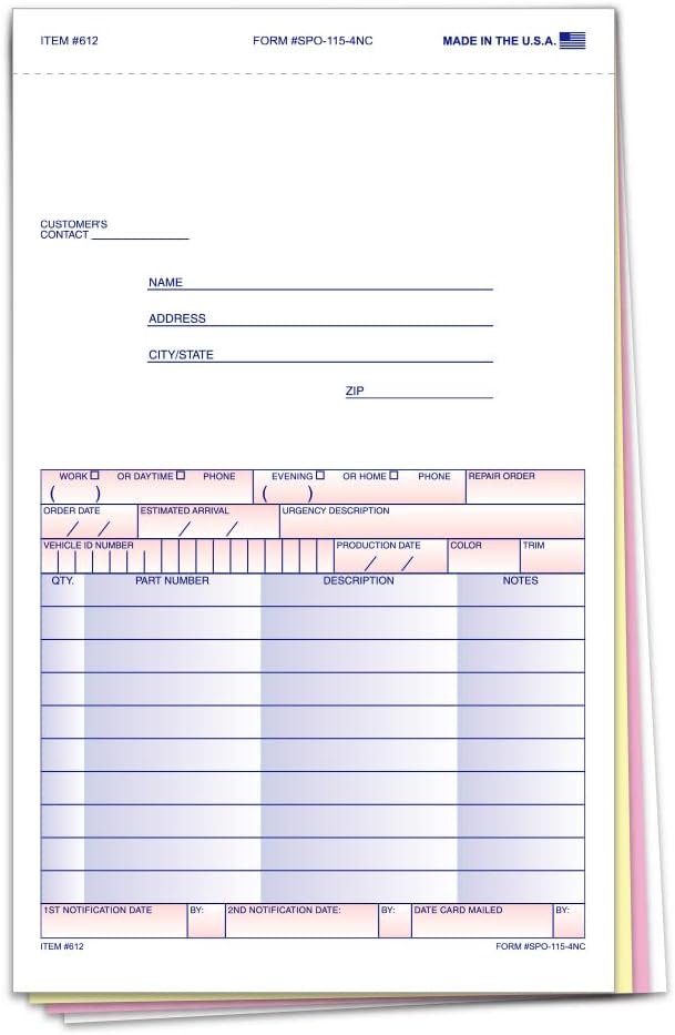 Experience seamless order processing and enhanced customer communication with our Special Parts Order Forms SPO-115-4NC. Crafted for businesses handling substantial orders like body or engine parts, these forms offer unparalleled versatility and convenience. The last part of these 4-part carbonless forms serves as both a customer message section and a postcard mailer, facilitating direct communication with customers regarding their orders. Crafted from premium carbonless paper-White, Canary, Pink, and White Tag-these forms produce clear, professional duplicates without the mess of traditional carbon sheets. Their efficient snap-out design, coupled with an extra perforation on the last page, ensures easy detachment and handling, streamlining your order processing workflow. Compact yet spacious at 5-2/3" x 9-1/4", these forms capture all necessary order details while remaining convenient to handle, store, and mail. Elevate your order management system with our Special Parts Order Forms SPO-115-4NC and unlock new levels of efficiency and professionalism for your business.