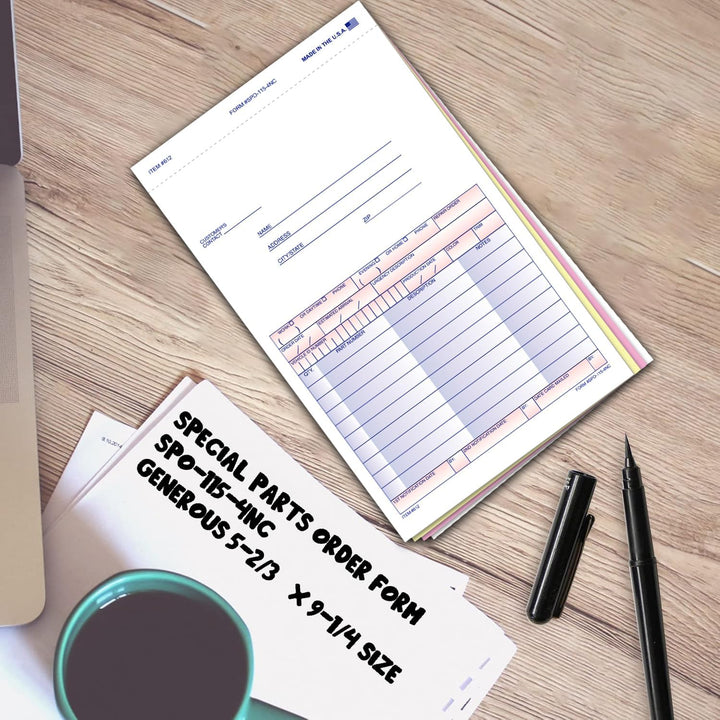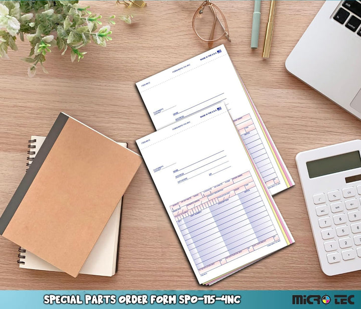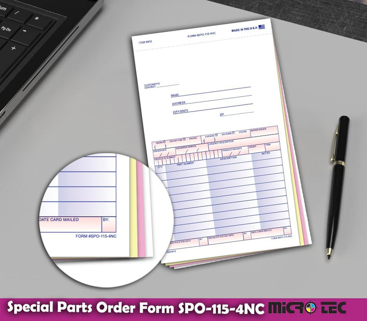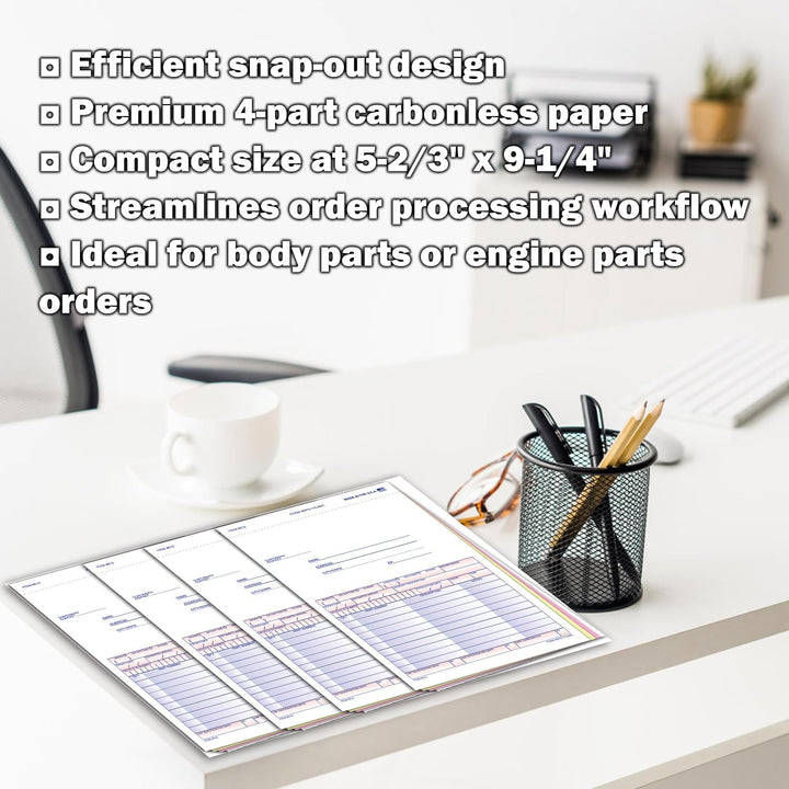 Special Parts Order Forms (SPO-115-4NC) – 4-Part Carbonless Snap-Out Auto Parts Order Forms with Customer Message Section & Postcard Mailer – 5-2/3" × 9-1/4" Multi-Colored Copies – Bulk Pack of 100