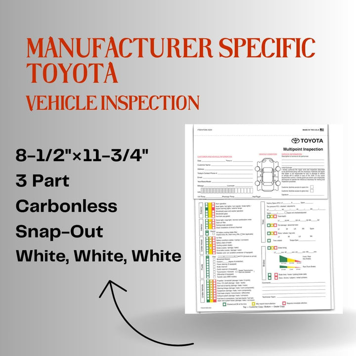 Upgrade your auto service documentation with our Toyota Inspection Forms, designed for manufacturer-specific inspections. Each form measures 8-1/2" × 11-3/4" and features a 3-part carbonless snap-out system for smooth, efficient recordkeeping. Full-color printing on all parts enhances readability, while the user-friendly layout ensures mechanics can quickly document and review inspection results. Perfect for Toyota dealerships, service centers, and auto repair shops, these forms streamline multi-point inspections and maintain professional documentation standards.
