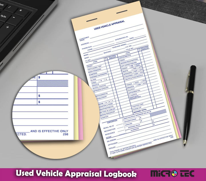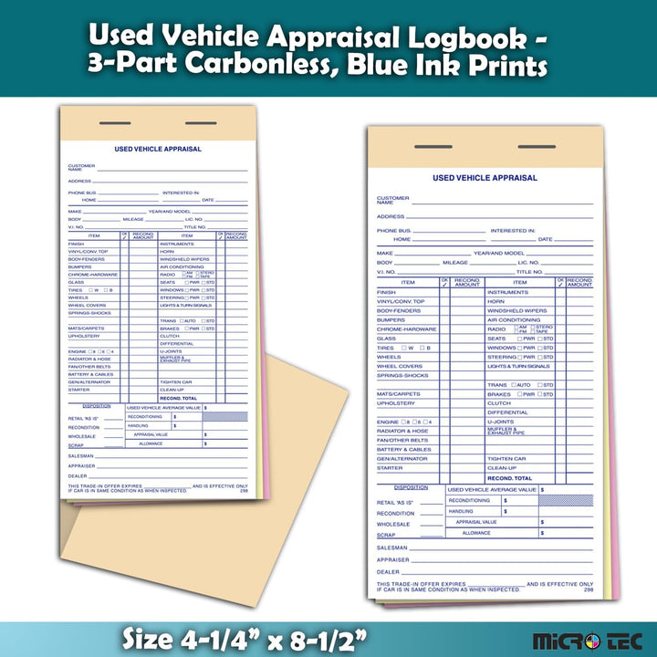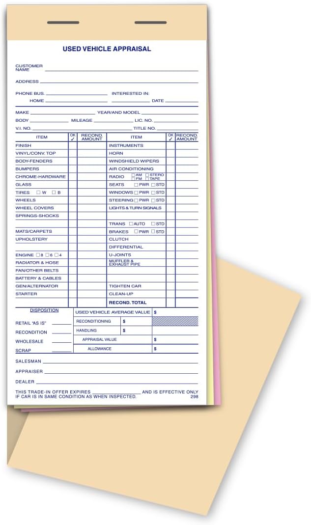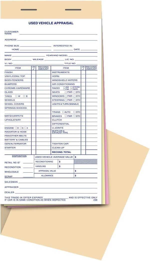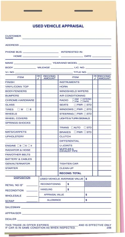 Used Vehicle Appraisal Book (Form 298) - 3-Part Snap-Out Forms with Heavy-Duty Wrap-Around Cover - 25 Forms per Book, Size 4.25" × 8.5"