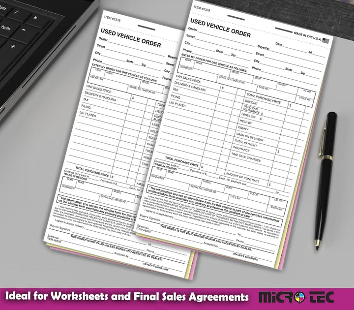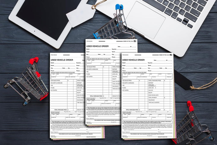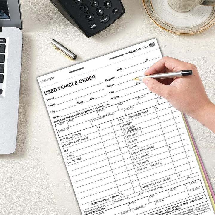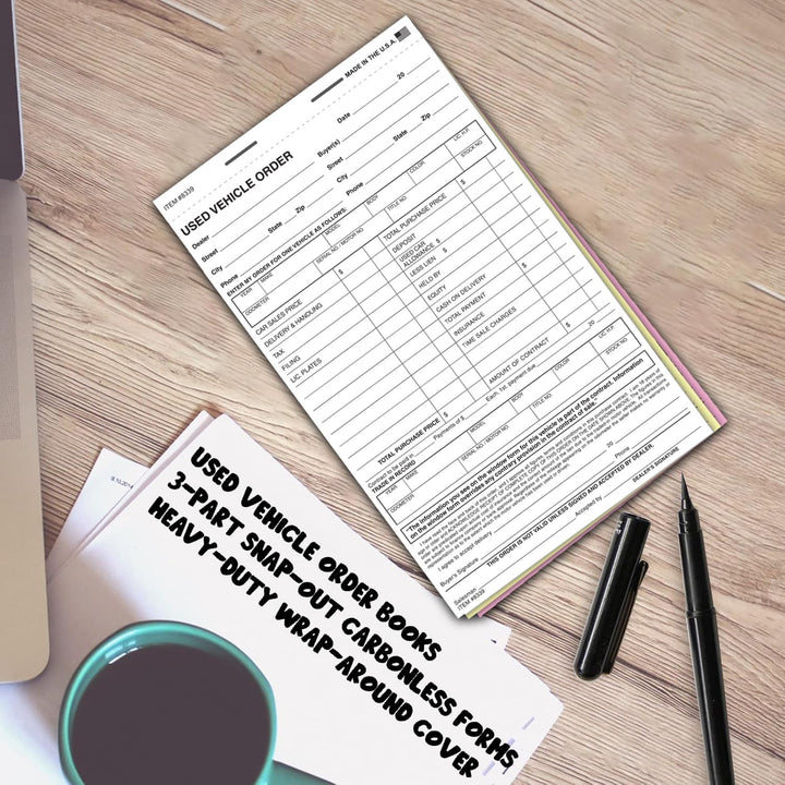 Enhance your vehicle sales process with our Used Vehicle Order Books. These versatile books serve as both worksheets and final sales agreements, essential for dealerships and automotive sales professionals. Each book contains 50 forms of 3-part snap-out carbonless sets, featuring White, Canary, and Pink sheets for comprehensive documentation. Measuring 5-1/2" x 9", these order books provide ample space for recording essential details during vehicle transactions. The carbonless design ensures clean and professional copies without the need for messy carbon paper, maintaining clarity and accuracy in documentation. The heavy-duty wrap-around cover prevents write-through, protecting forms underneath and ensuring every record remains pristine. Ideal for use in various sales environments, these books streamline the sales process while maintaining a professional appearance. The snap-out design facilitates easy distribution of copies, whether for customer records, administrative use, or your own records. Invest in our Used Vehicle Order Books for a reliable, user-friendly solution to streamline your vehicle sales operations.