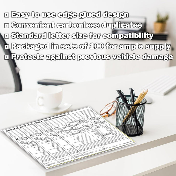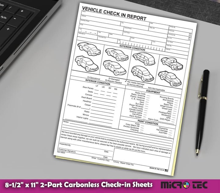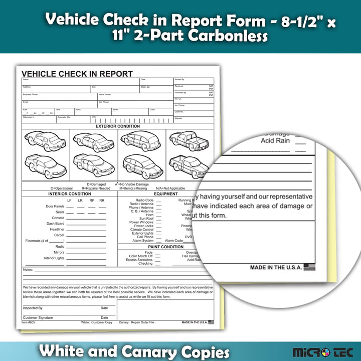 Vehicle Check-In Report Form - 8.5" x 11" 2-Part Carbonless Inspection Sheets - White & Canary Copies for Dealerships, Service Centers, and Fleet Management - Pack of 100