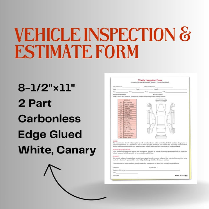 Vehicle Inspection & Estimate Form - 2 Part Carbonless Vehicle Inspection Form for Initial Walk-Around, Repairs Estimate, and Final Approval - 8-1/2"×11" Edge Glued - White, Canary
