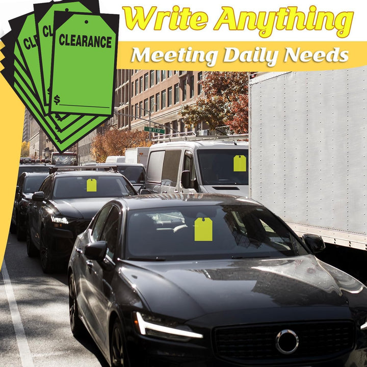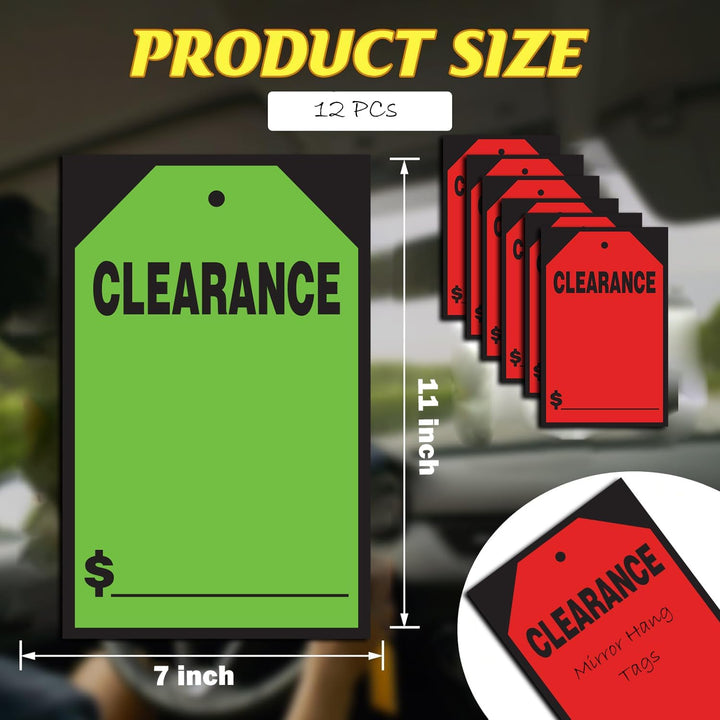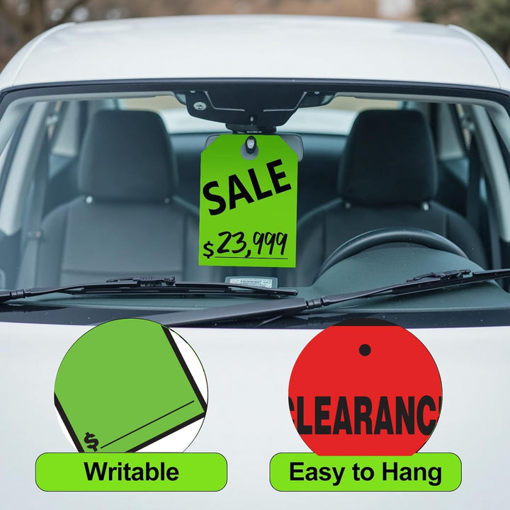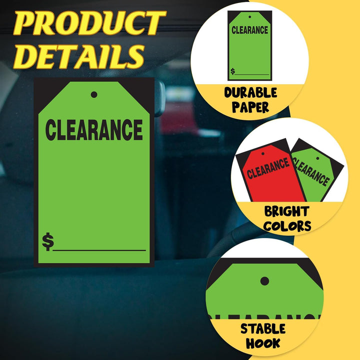 ✨ Eye-Catching Clearance Design: Bright green clearance stickers and hang tags designed to attract customers and highlight discounted prices on vehicles, retail products, and sale items.