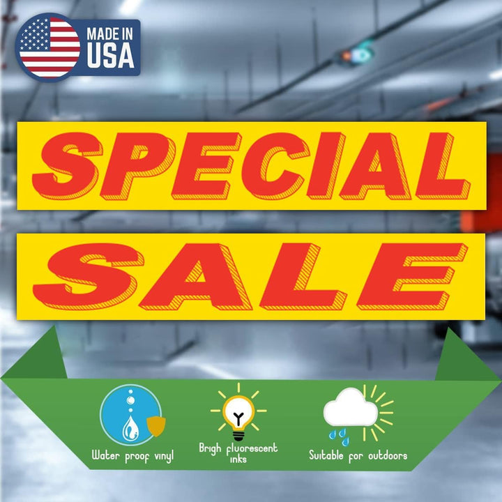 HIGH-VISIBILITY PROMOTIONAL STICKERS: Bold red text on bright yellow vinyl designed to capture attention instantly, perfect for automotive sales, window decals, and marketing campaigns.
