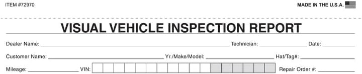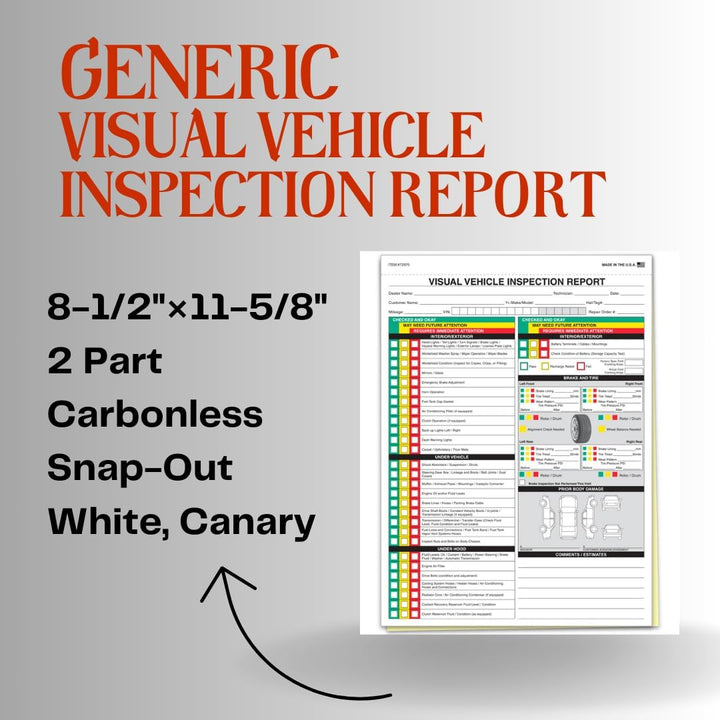 Enhance your auto care services with our Generic Visual Vehicle Inspection Report Forms. Designed for a comprehensive visual inspection, these forms offer a versatile solution for documenting vehicle assessments. Sized at 8-1/2"×11-5/8", they provide ample space for detailed entries while remaining practical for everyday use. The 2-part carbonless system, featuring a user-friendly snap-out design, ensures a smooth and efficient documentation process. Each form comes in White and Canary, with all parts featuring Full Color for enhanced visual clarity. We understand the importance of visual clarity in inspection records. That's why our forms feature Full Color printing on all parts, enhancing the overall visual appeal and ensuring easy interpretation. The user-friendly layout ensures that mechanics can effortlessly document and review inspection results, making these forms an invaluable tool for your auto service center.