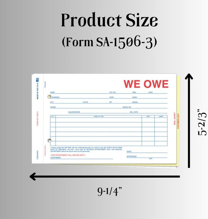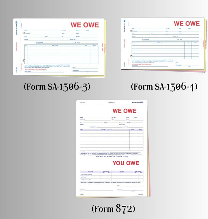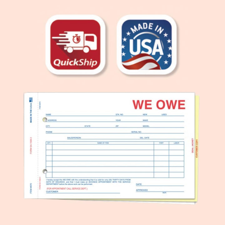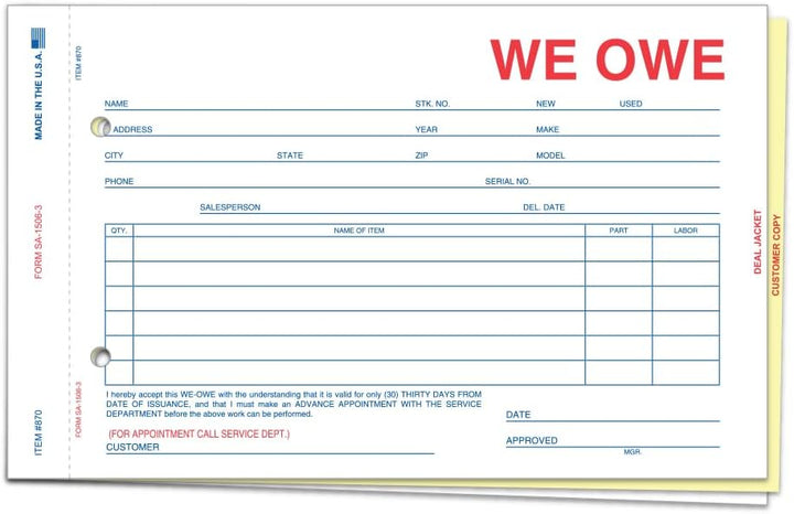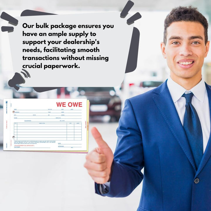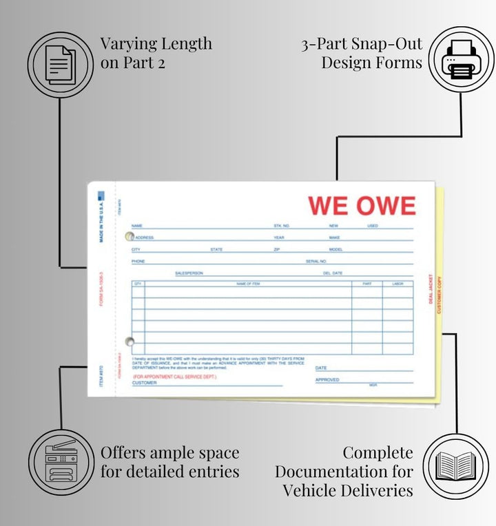 We Owe/You Owe Forms for Car Dealership - 3-Part/4-Part Carbonless Snap-Out Forms - Complete Documentation for Vehicle Deliveries - White, Canary, Pink